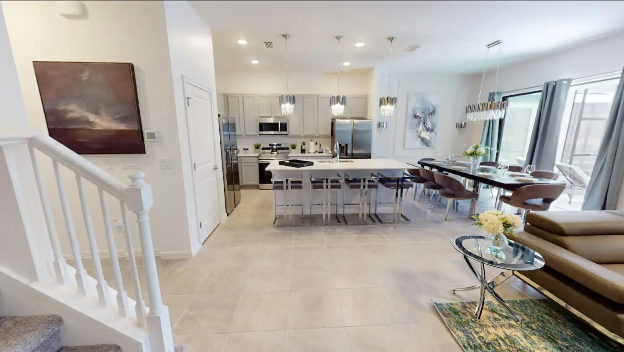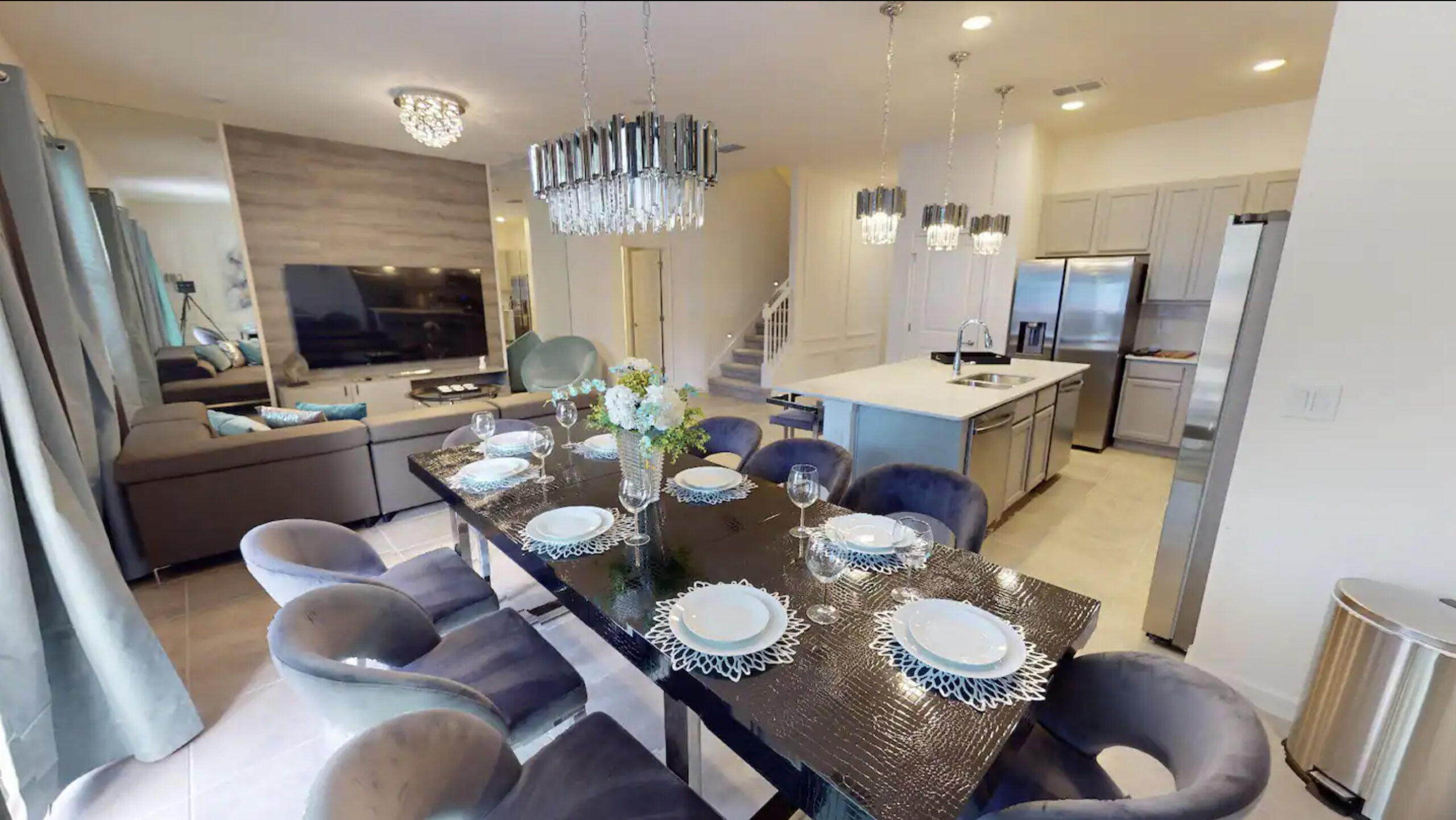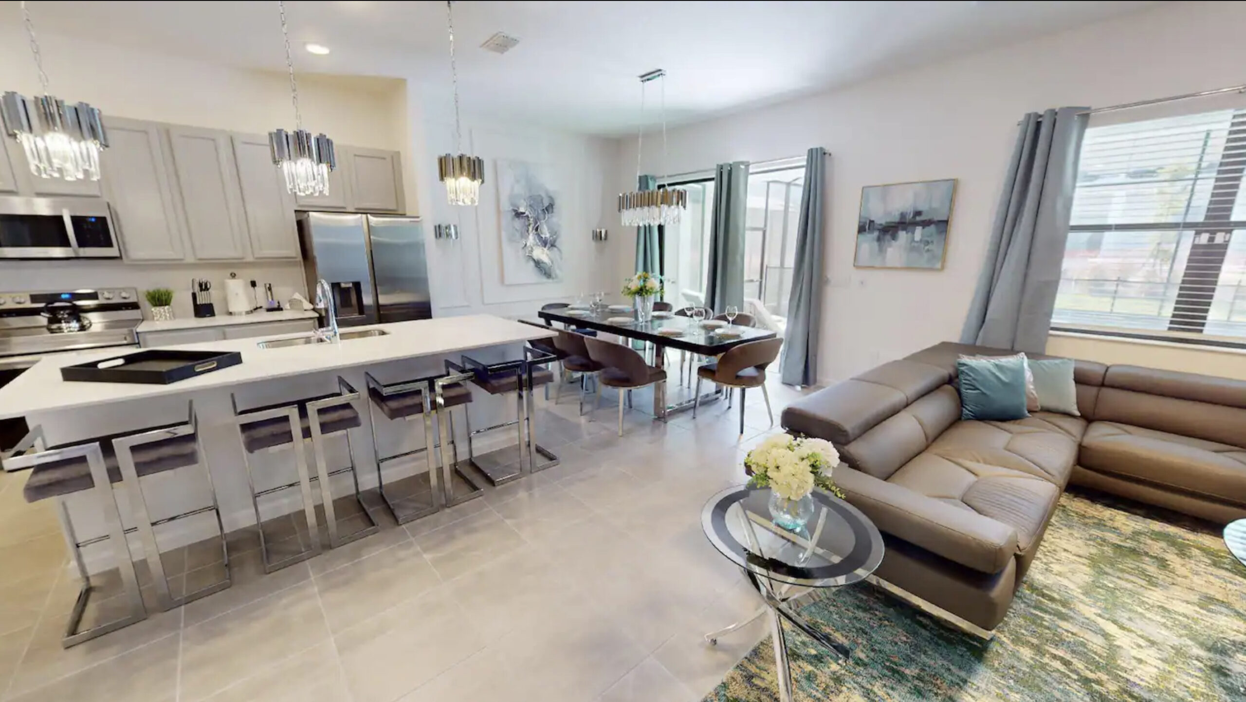 LIVING/DINING: Step into the bright, chic, and inviting open-plan living/dining area, setting the stage for your unforgettable stay. White marble floors complement the stylish accent furnishings, including two cozy sectional couches and plush chairs. Transition seamlessly from relaxation to dining at the sleek white table, adorned with glamorous teal and gray dining chairs, comfortably seating 10 guests in sophisticated comfort.