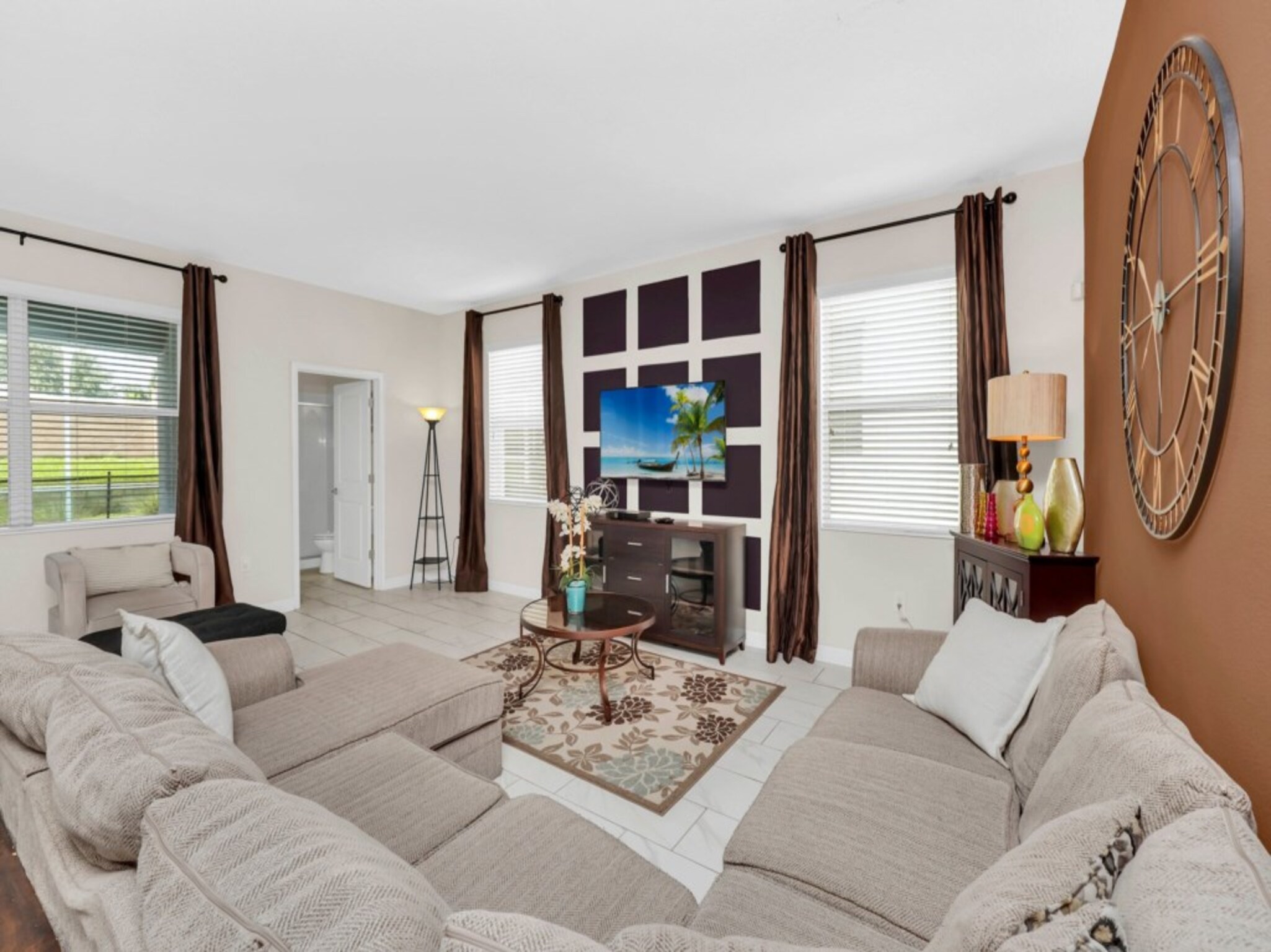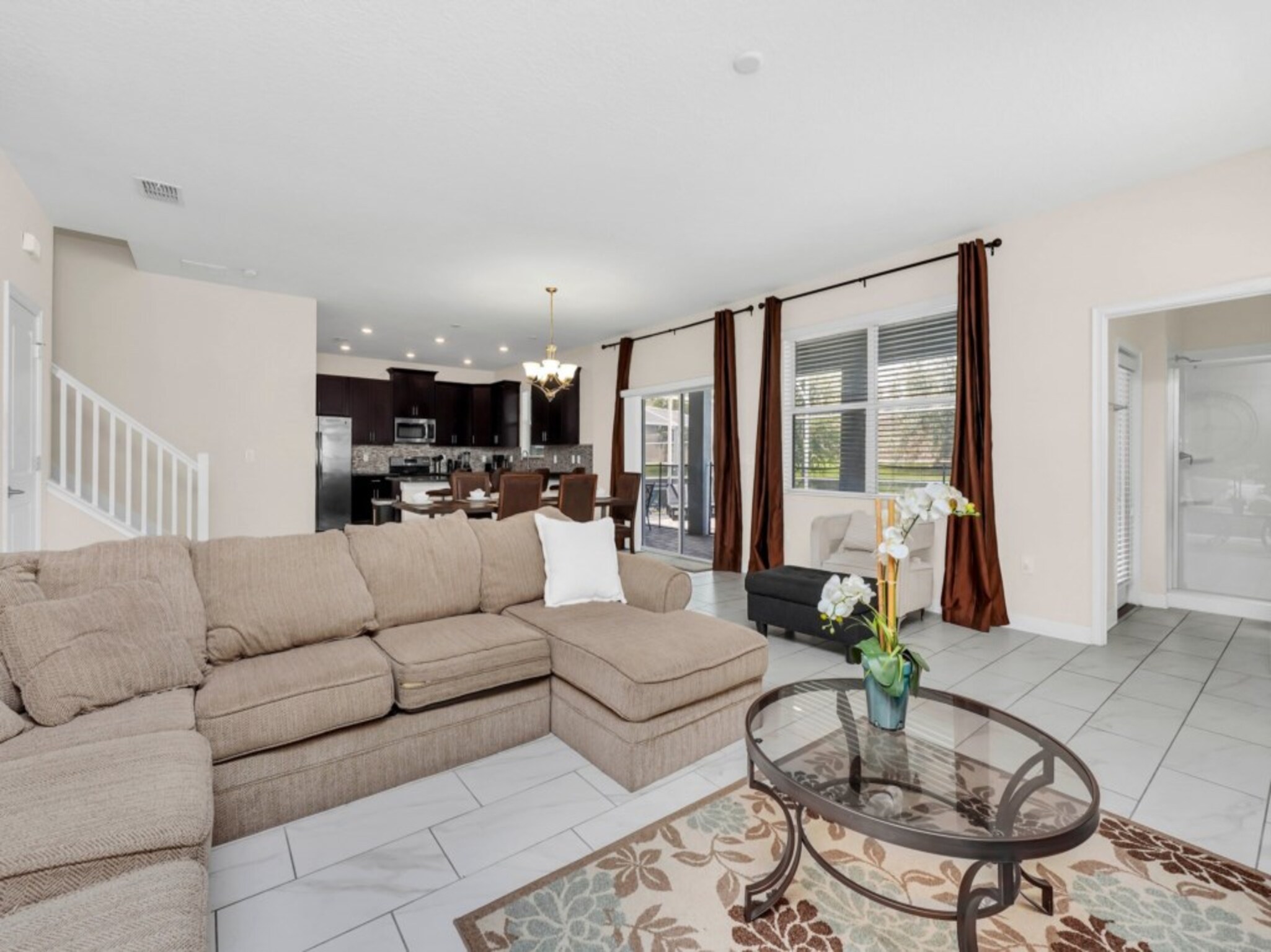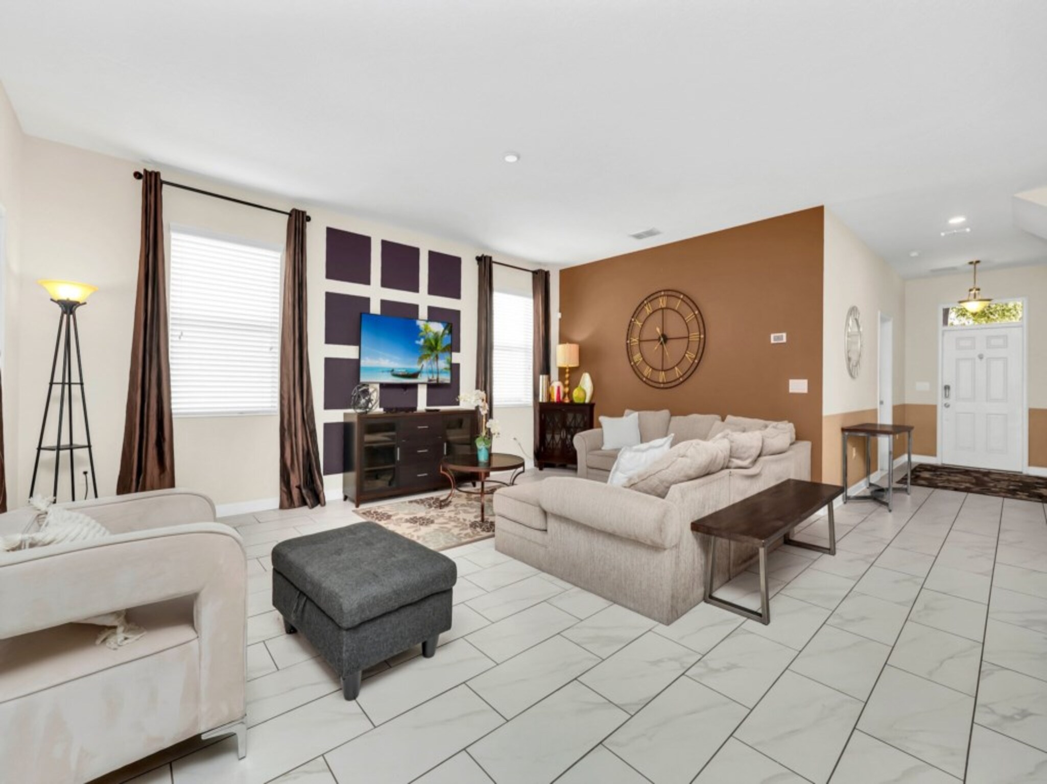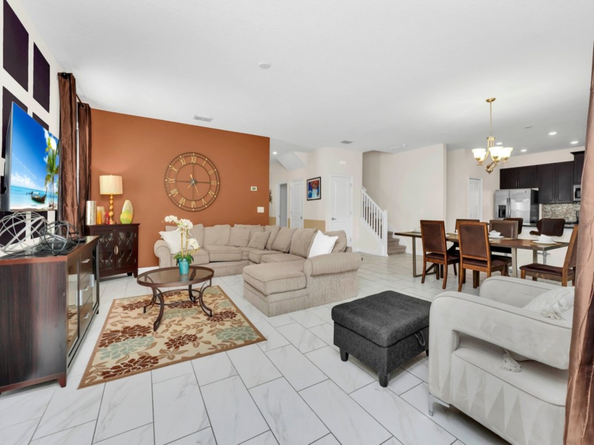 This stylish 6-bedroom, 5-bathroom, a vacation home can comfortably accommodate 12 guests in a luxurious living space, offering an ideal size and layout for large families and groups traveling together. As you walk into the home you will be welcomed into the open-concept living area. The modern-styled kitchen has stainless steel appliances and sleek countertops, perfect for prepping meals for the whole family. Have seat at the breakfast bar and plan out the day, or enjoy a snack before heading out to a theme park. The living area has plenty of comfortable seating for everyone to come together and watch a TV show.