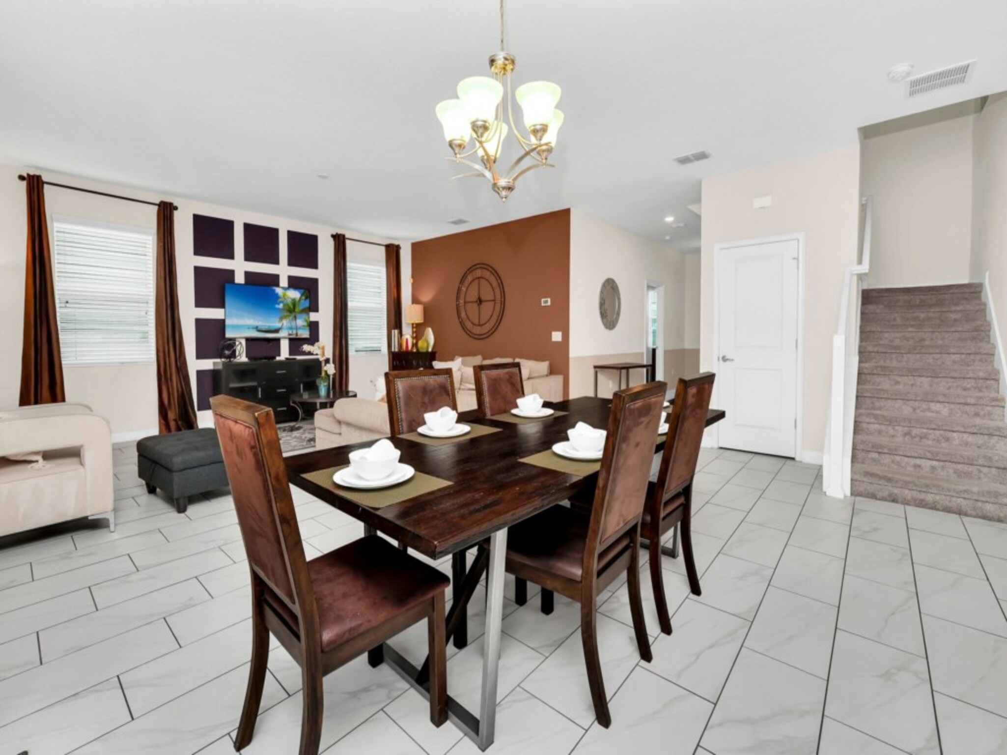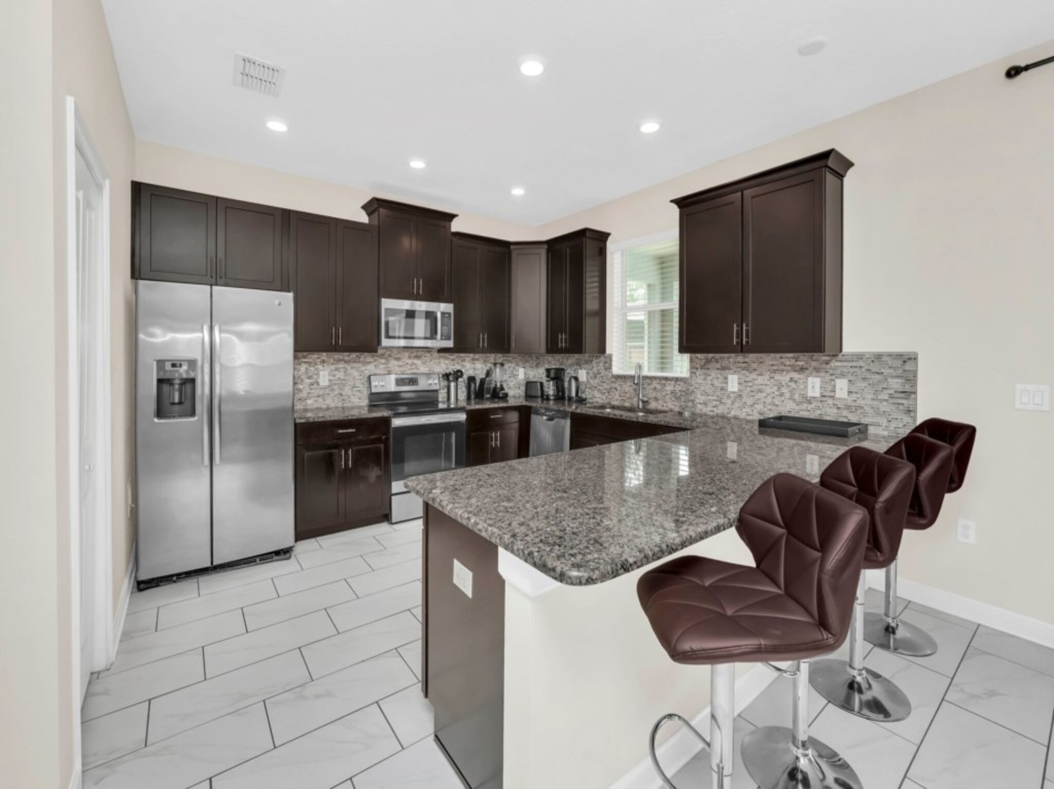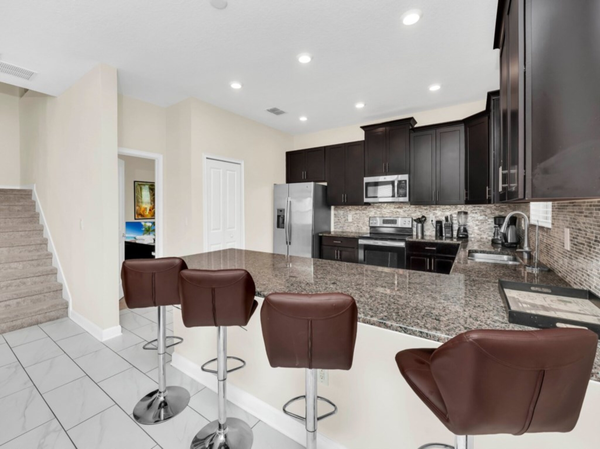 This stylish 6-bedroom, 5-bathroom, a vacation home can comfortably accommodate 12 guests in a luxurious living space, offering an ideal size and layout for large families and groups traveling together. As you walk into the home you will be welcomed into the open-concept living area. The modern-styled kitchen has stainless steel appliances and sleek countertops, perfect for prepping meals for the whole family. Have seat at the breakfast bar and plan out the day, or enjoy a snack before heading out to a theme park. The living area has plenty of comfortable seating for everyone to come together and watch a TV show.