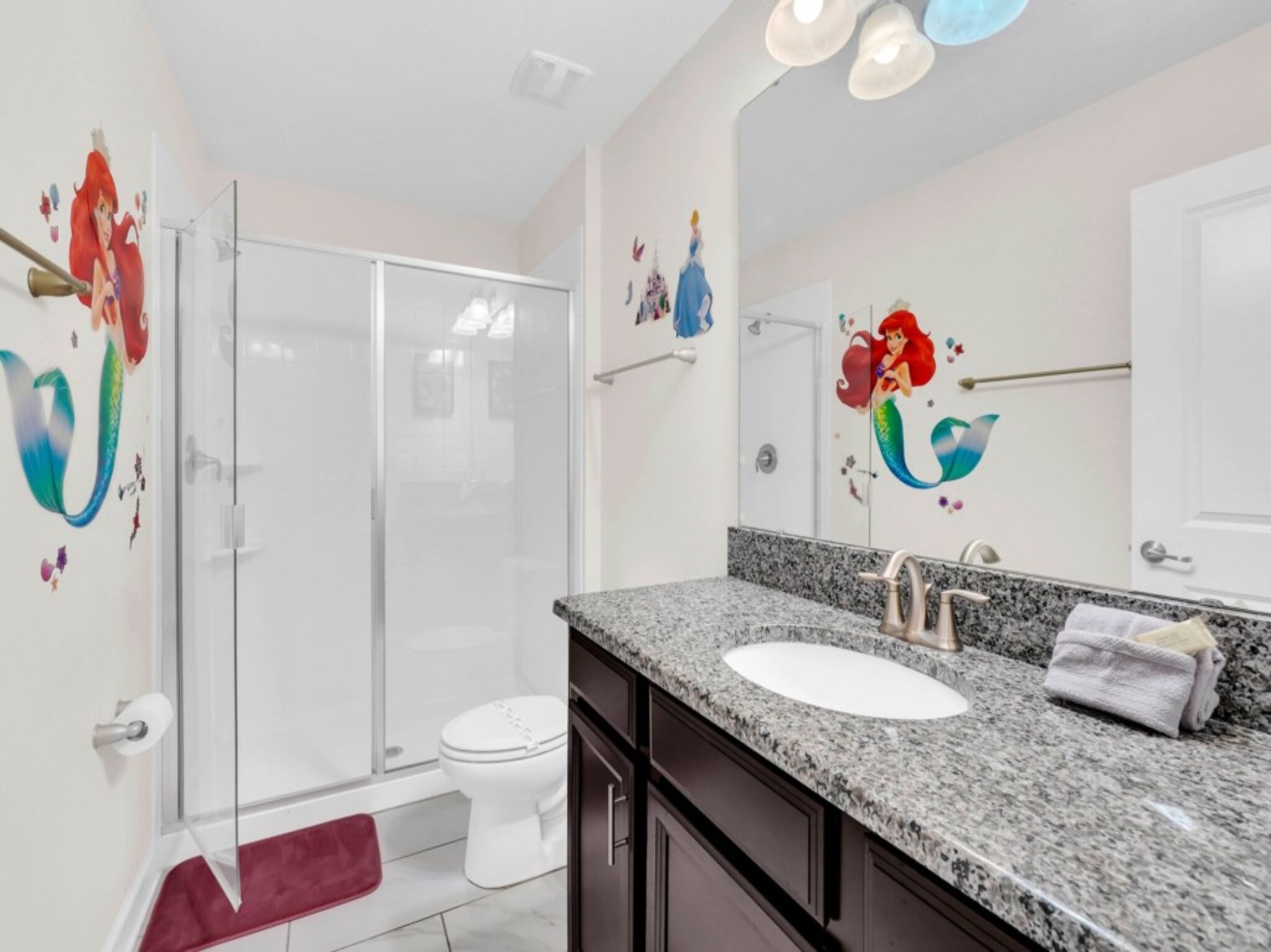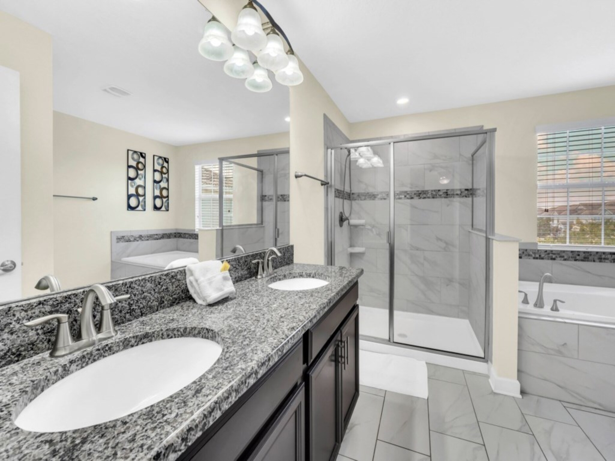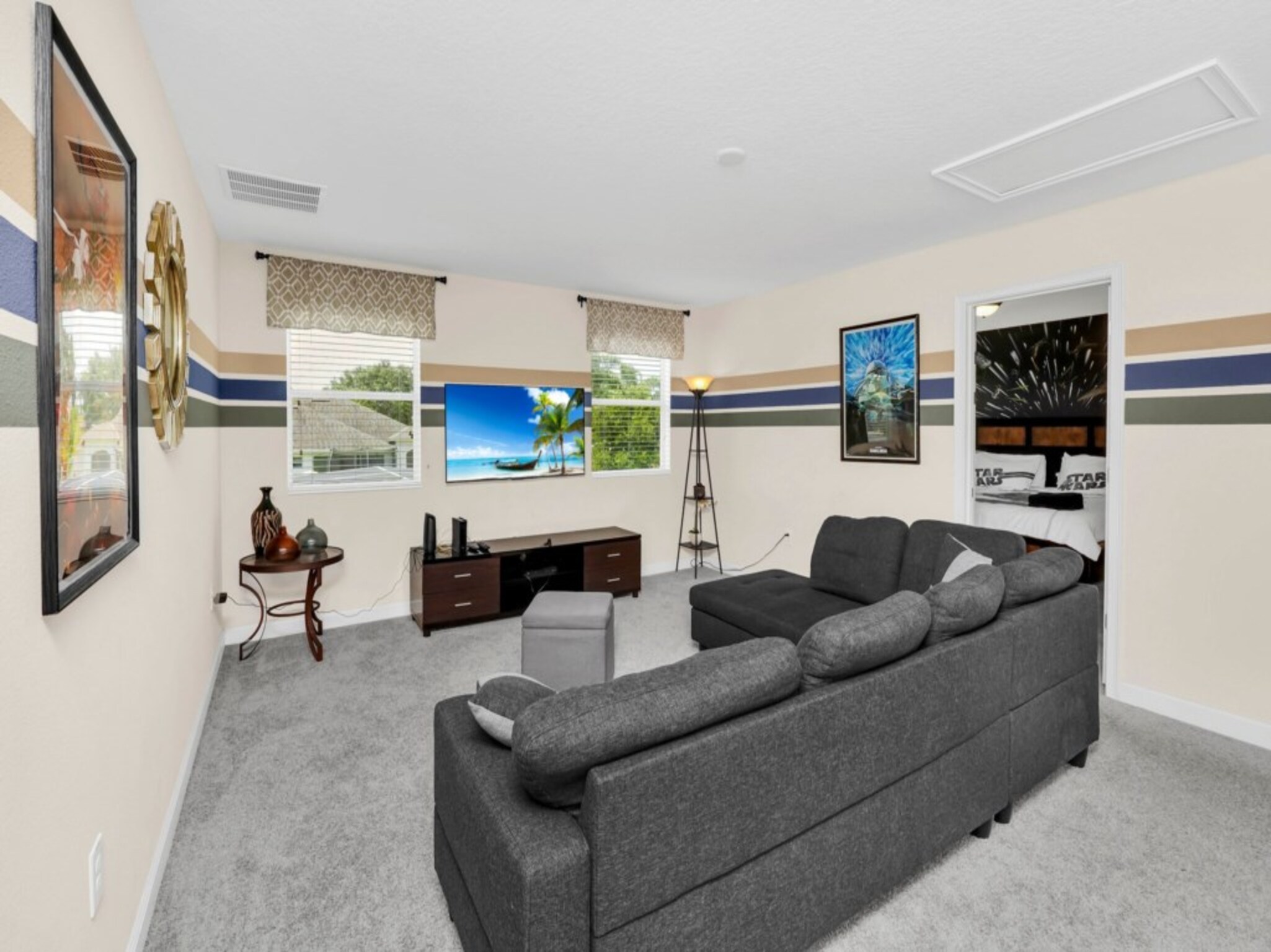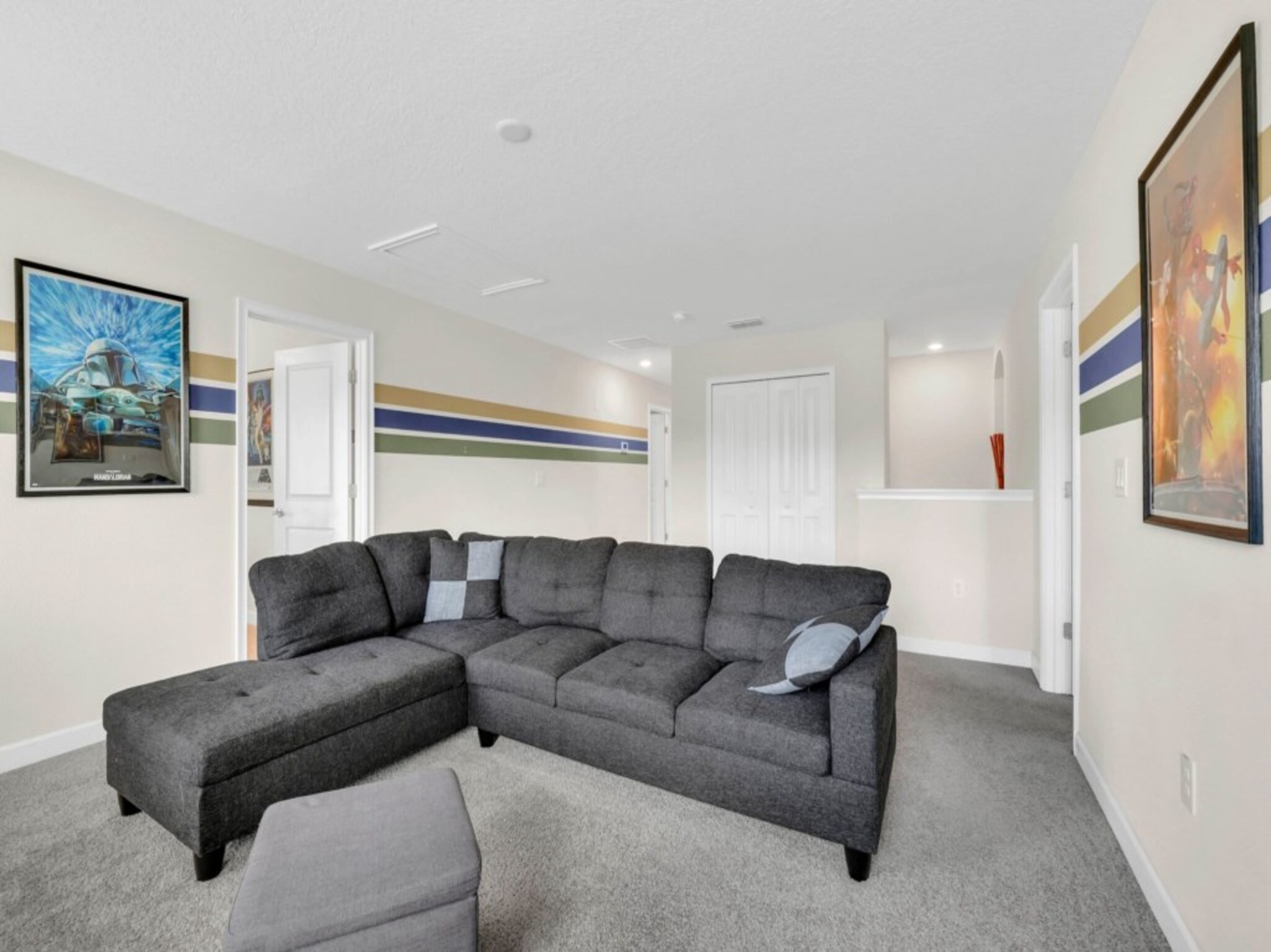This stylish 6-bedroom, 5-bathroom, a vacation home can comfortably accommodate 12 guests in a luxurious living space, offering an ideal size and layout for large families and groups traveling together. As you walk into the home you will be welcomed into the open-concept living area. The modern-styled kitchen has stainless steel appliances and sleek countertops, perfect for prepping meals for the whole family. Have seat at the breakfast bar and plan out the day, or enjoy a snack before heading out to a theme park. The living area has plenty of comfortable seating for everyone to come together and watch a TV show.