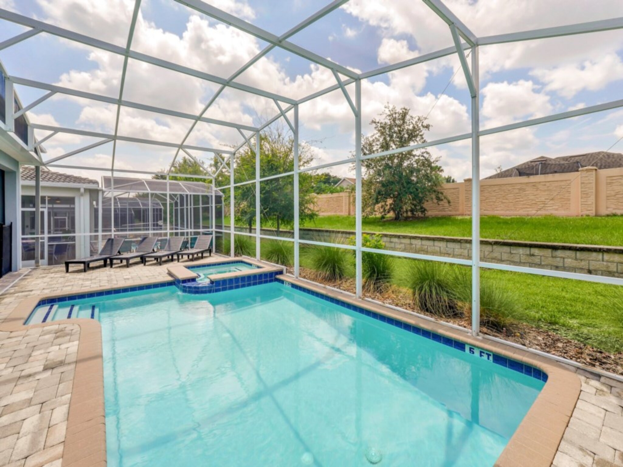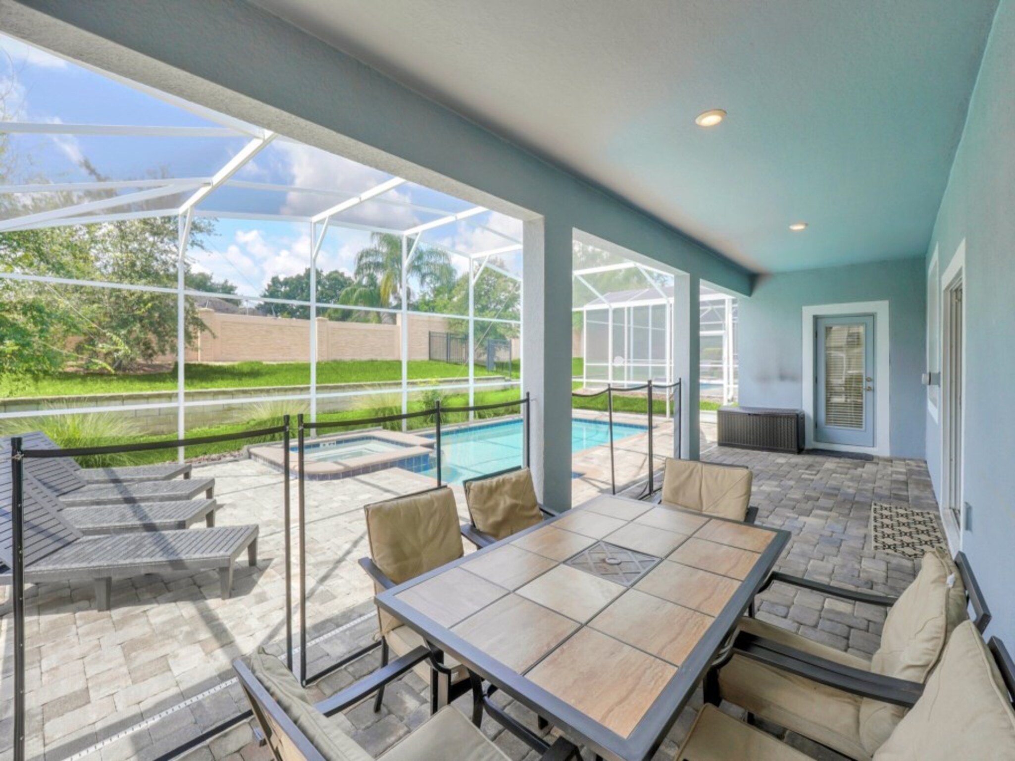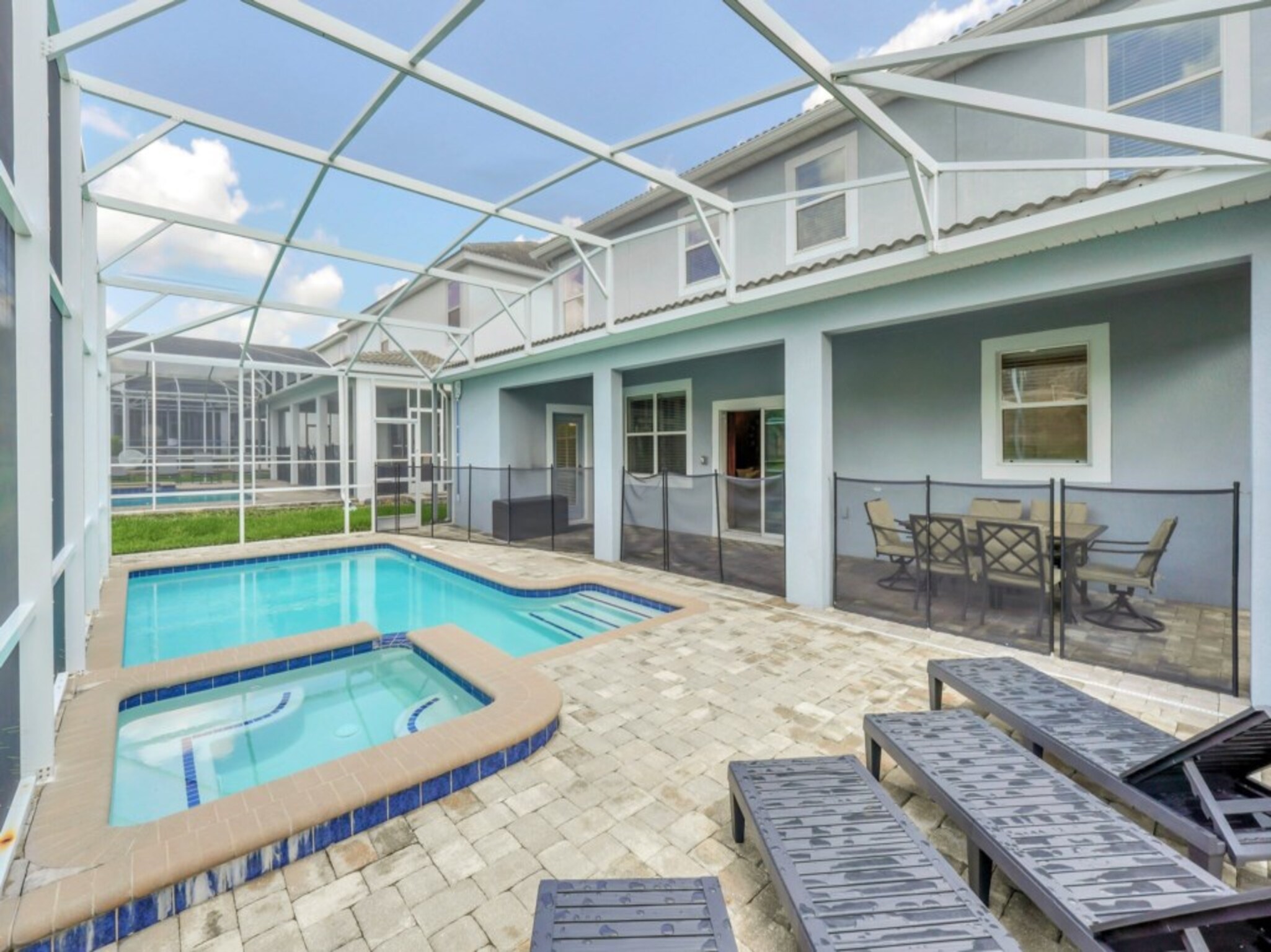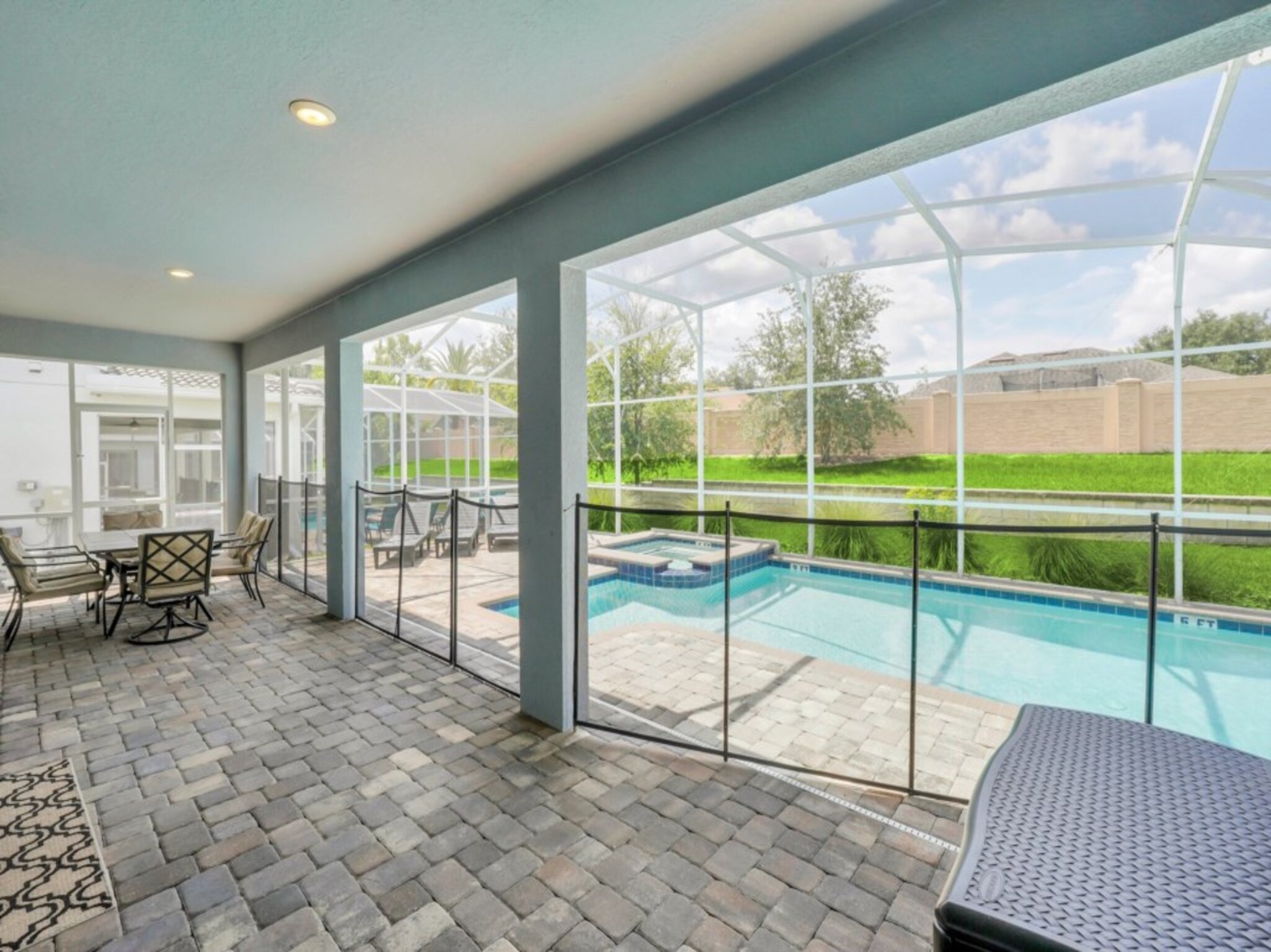 Walk onto the private patio to your own screened-in pool with a spillover spa. Relax in a sun lounger or take a dip to cool off. There is an outdoor dining table so you can dine under the stars. Stay entertained with the built-in TV. If you have little ones, there is a safety fence that can be set up as well.