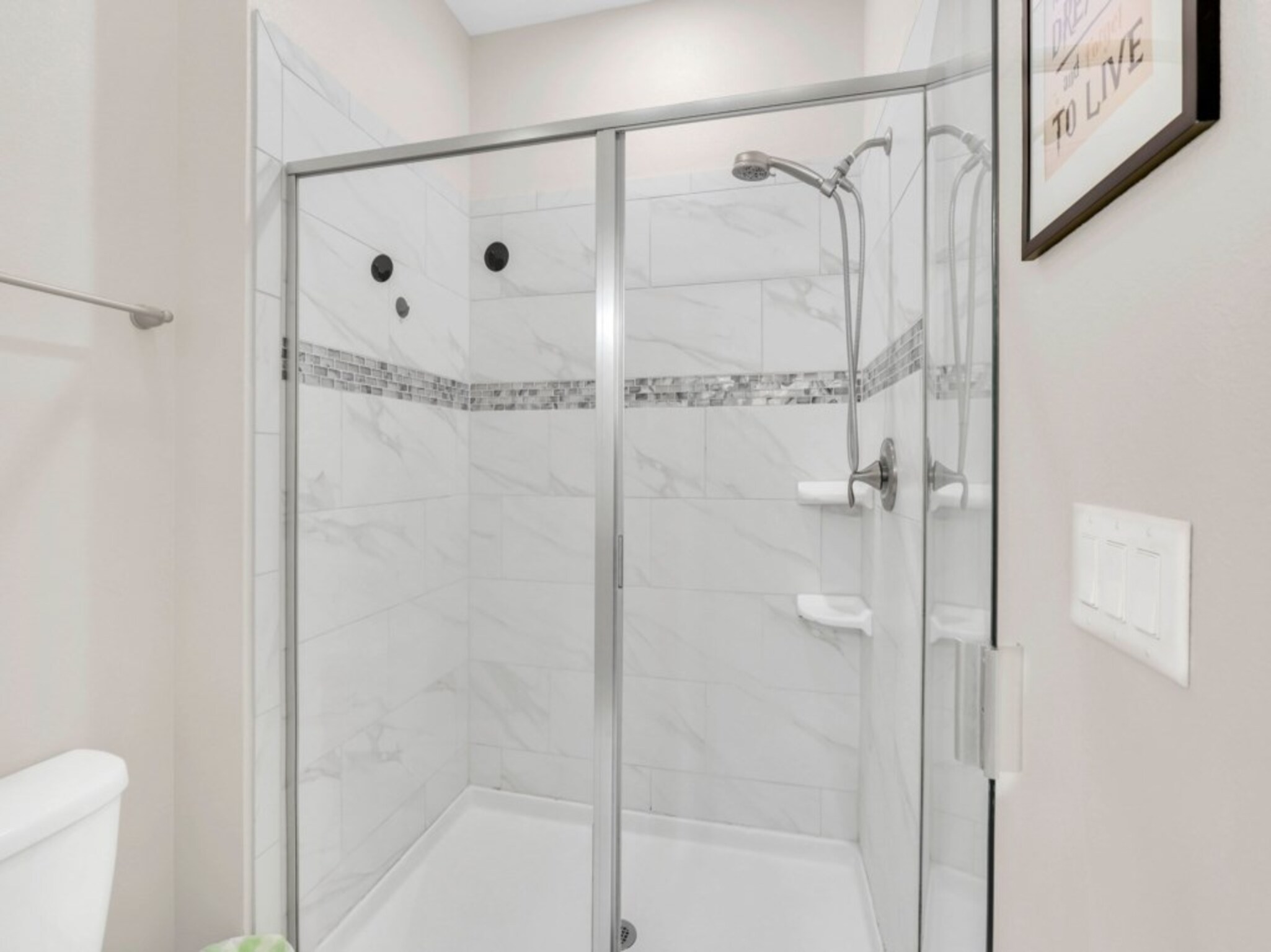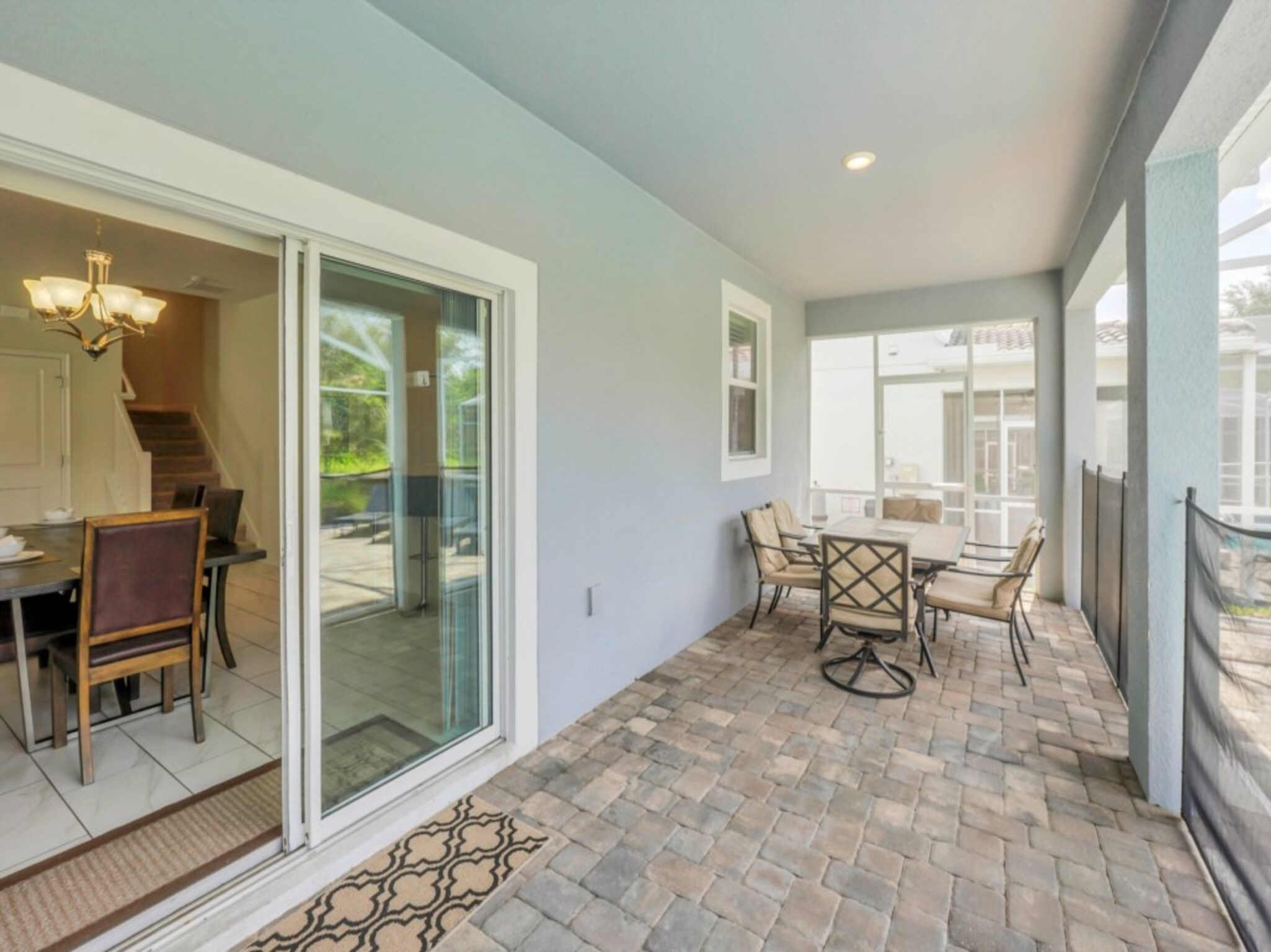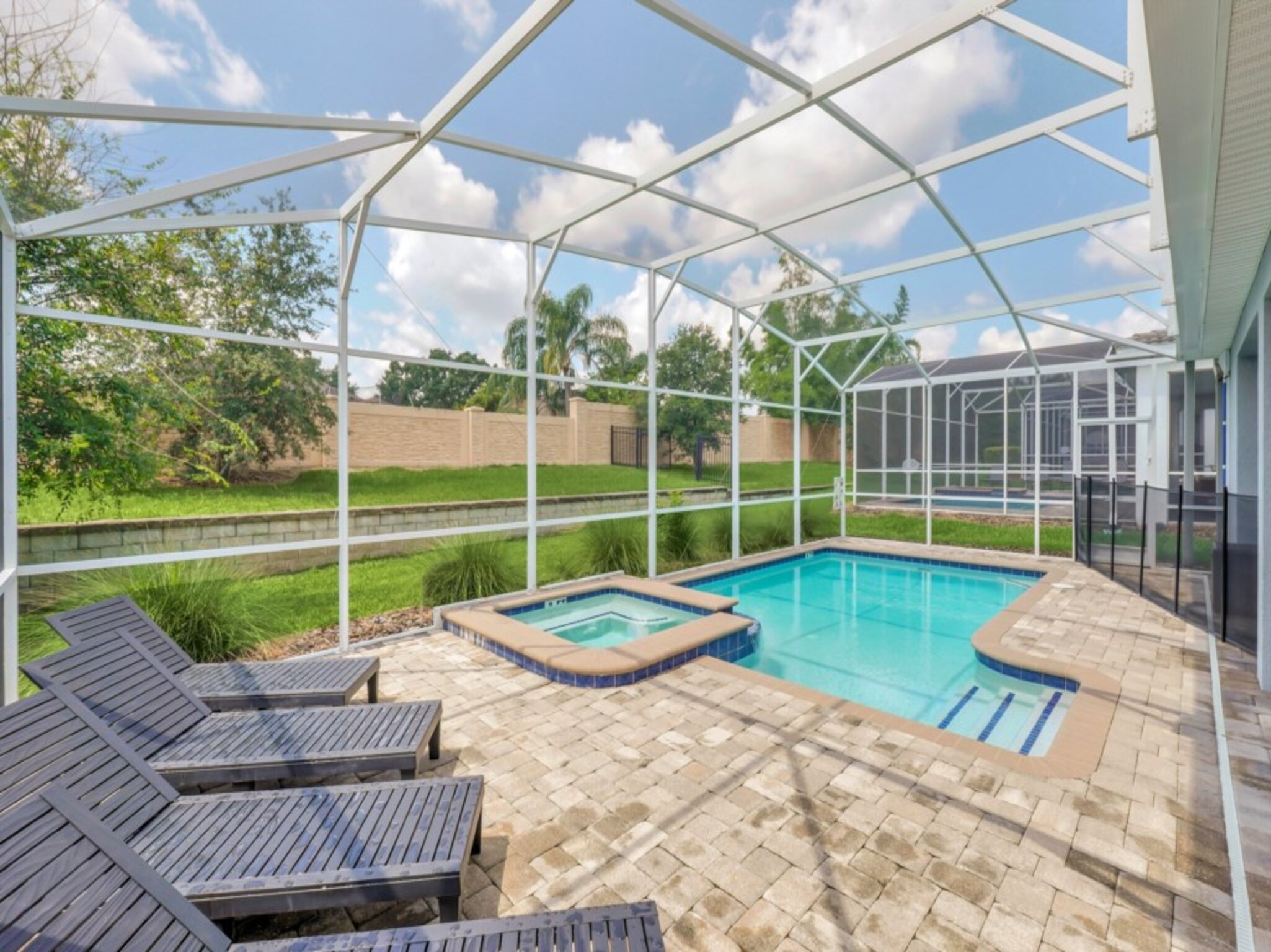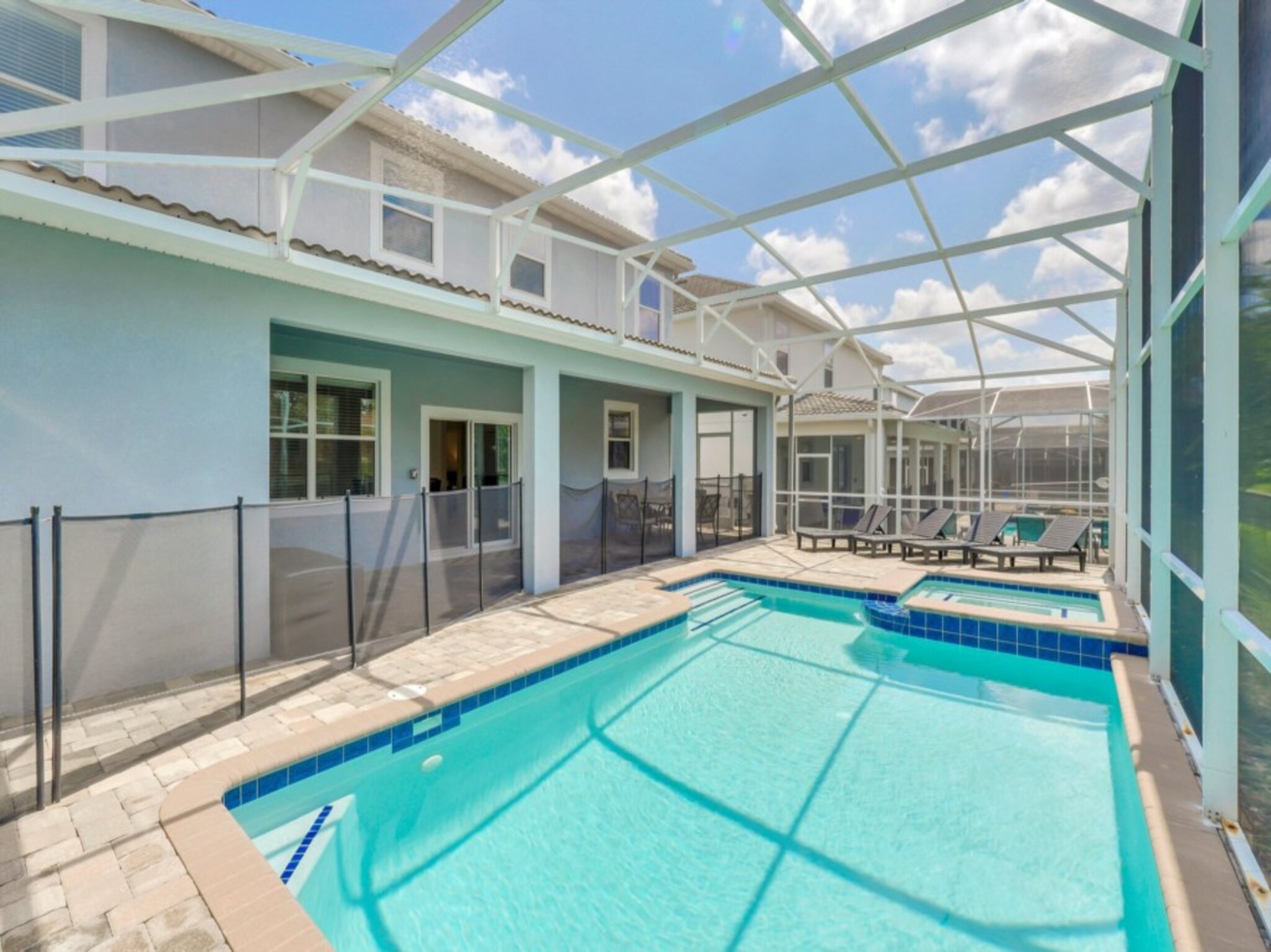 Walk onto the private patio to your own screened-in pool with a spillover spa. Relax in a sun lounger or take a dip to cool off. There is an outdoor dining table so you can dine under the stars. Stay entertained with the built-in TV. If you have little ones, there is a safety fence that can be set up as well.