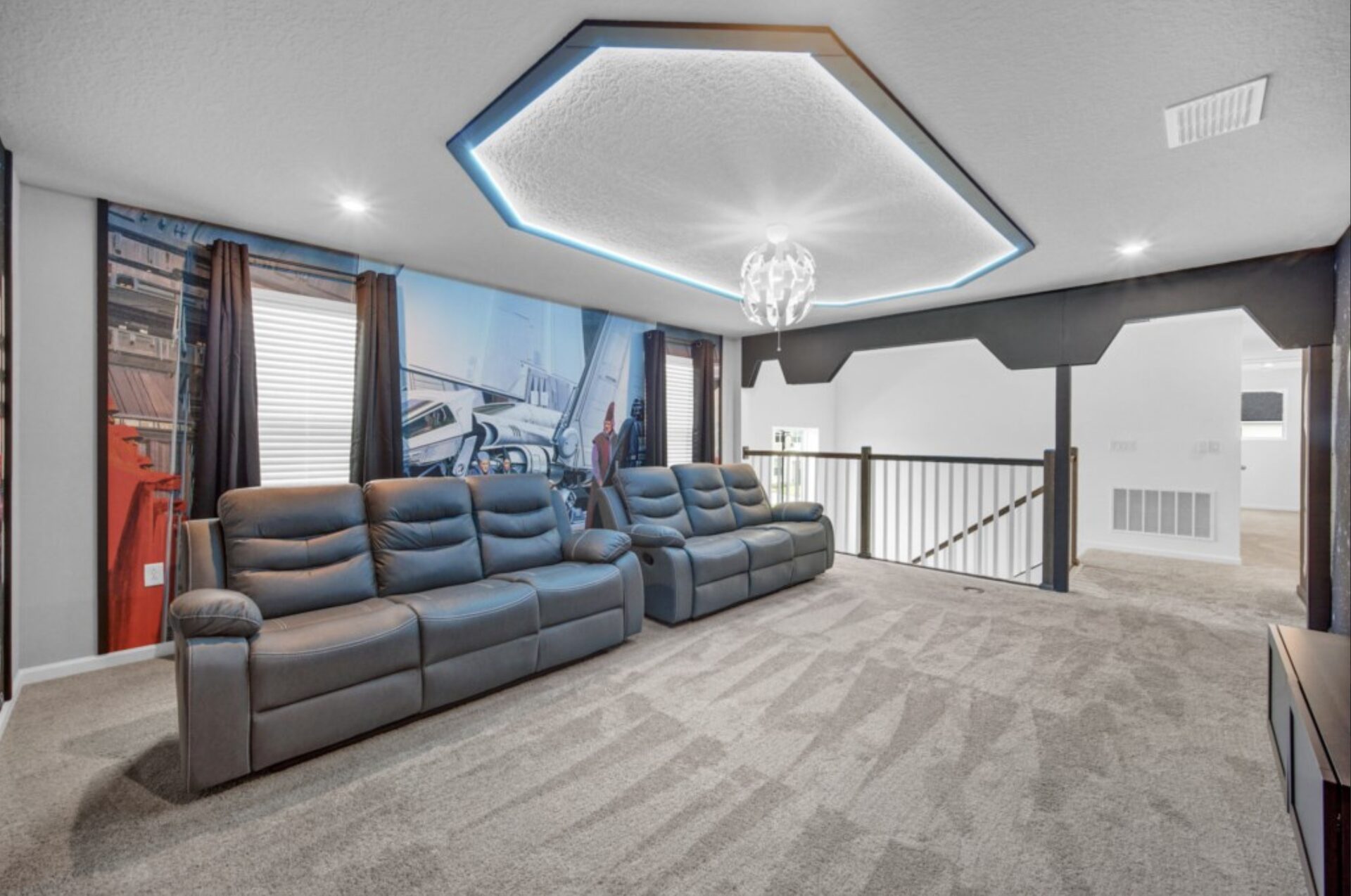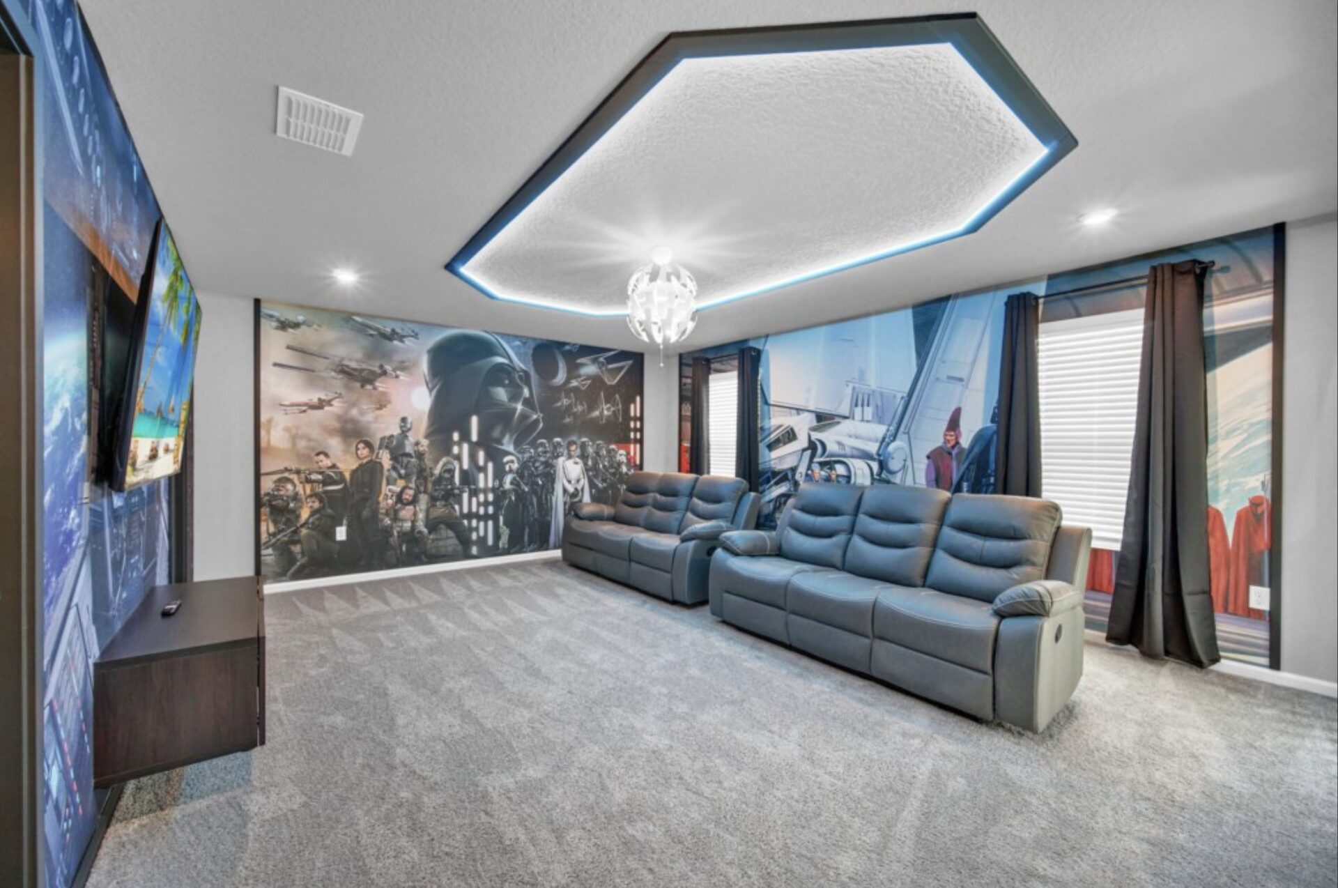 Indoor entertainment awaits to promise hours of amusement for guests of all ages. Ascend to the upper level, where a loft, a theater room with sofas recliners with a flat-screen TV provides a cozy retreat.