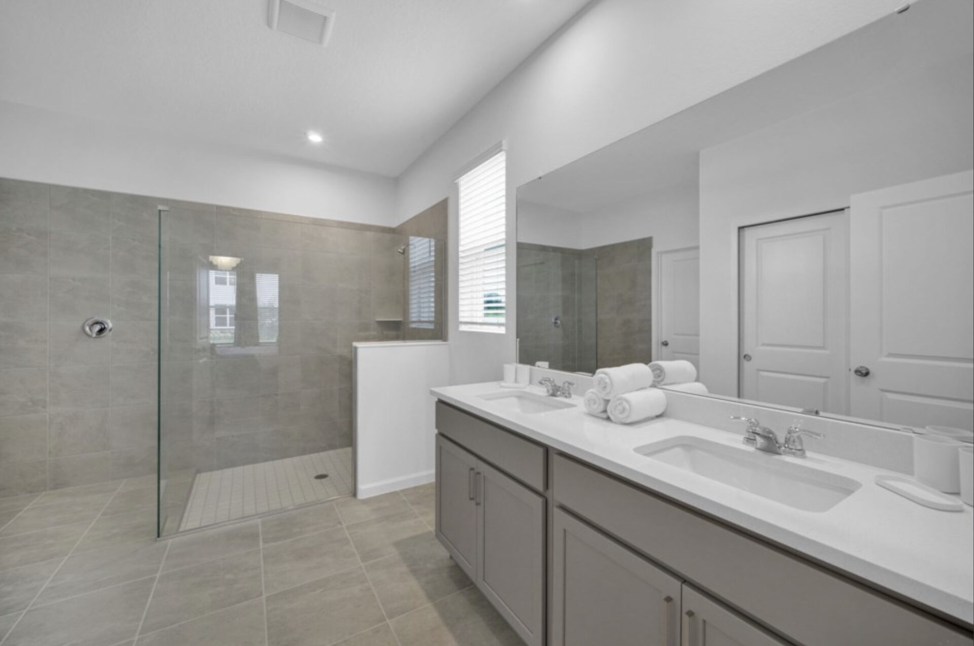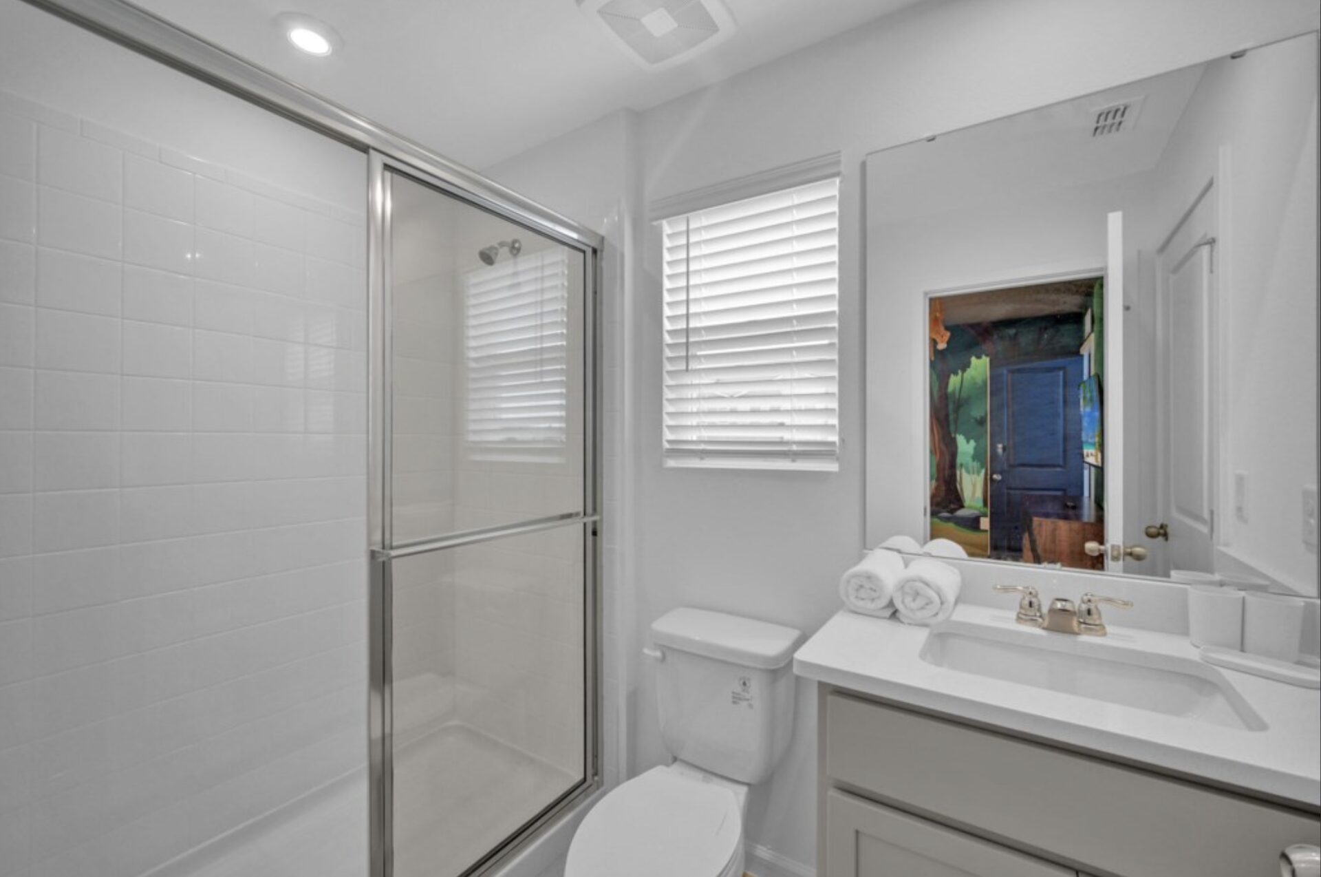 The pool area is destined to be a family favorite, offering the perfect respite to cool off after a day basking in the Orlando Florida sun. For sun enthusiasts, comfortable sunbeds are strategically placed around the pool, creating an ideal spot for soaking up rays. Those seeking shelter from direct sunlight can retreat to the shaded lanai, complete with a spacious seating area. Additionally, a convenient outdoor bathroom ensures easy access for extended hours of swimming enjoyment.