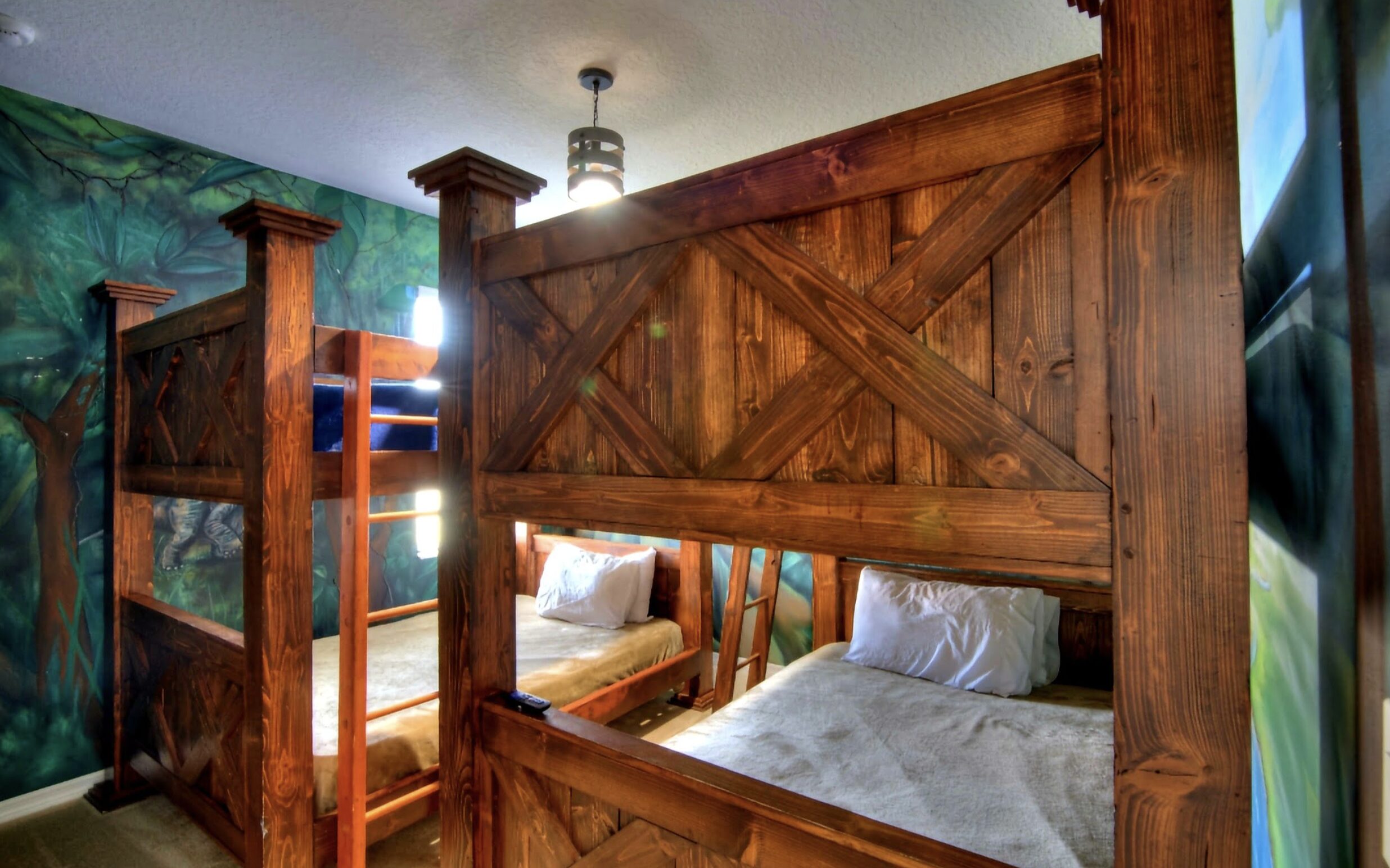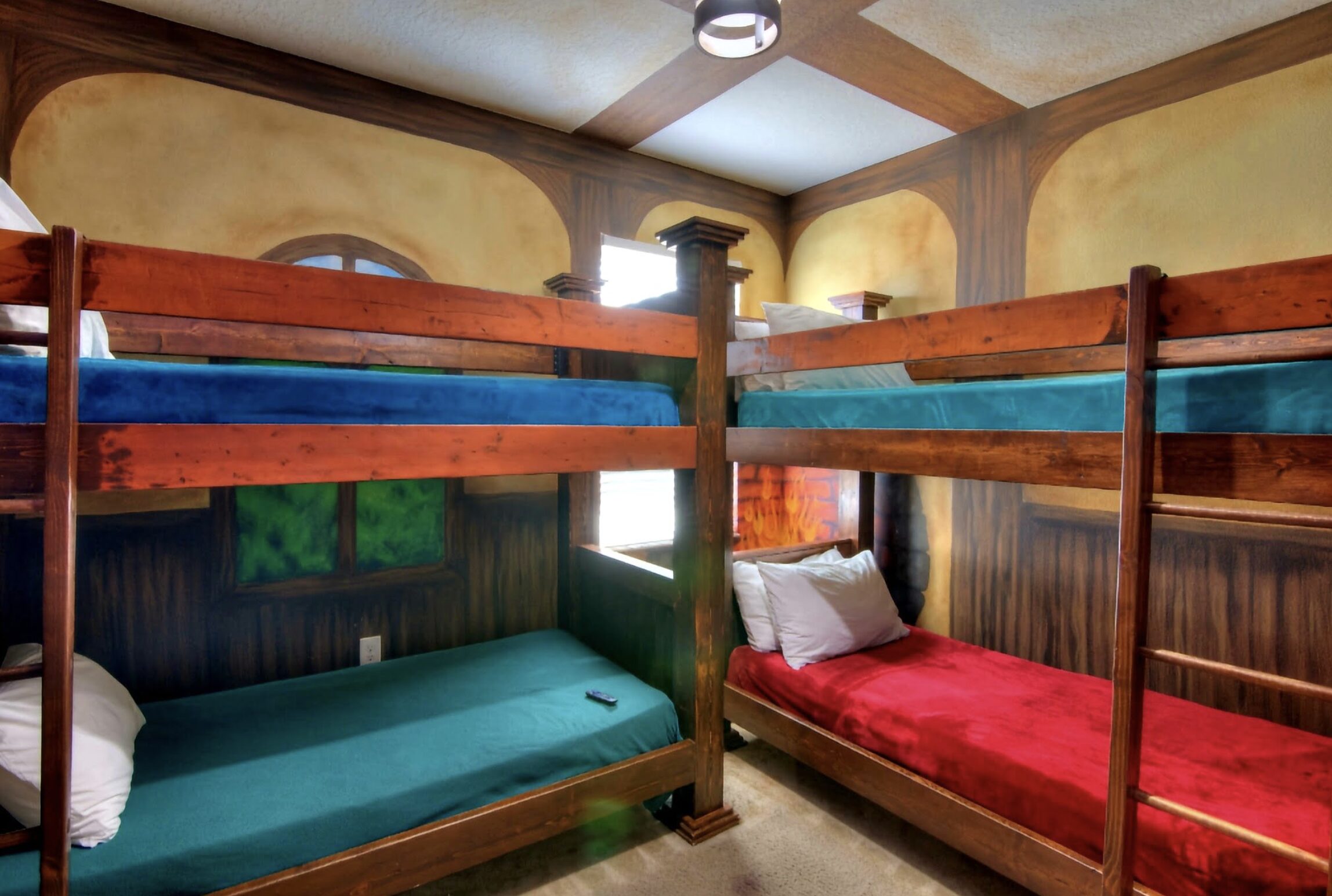 There are 12 king bedrooms and 2 kids’ rooms, one with 2 sets of full-over-full bunk beds, And the other with 2 sets of twin-over-twin bunk beds.