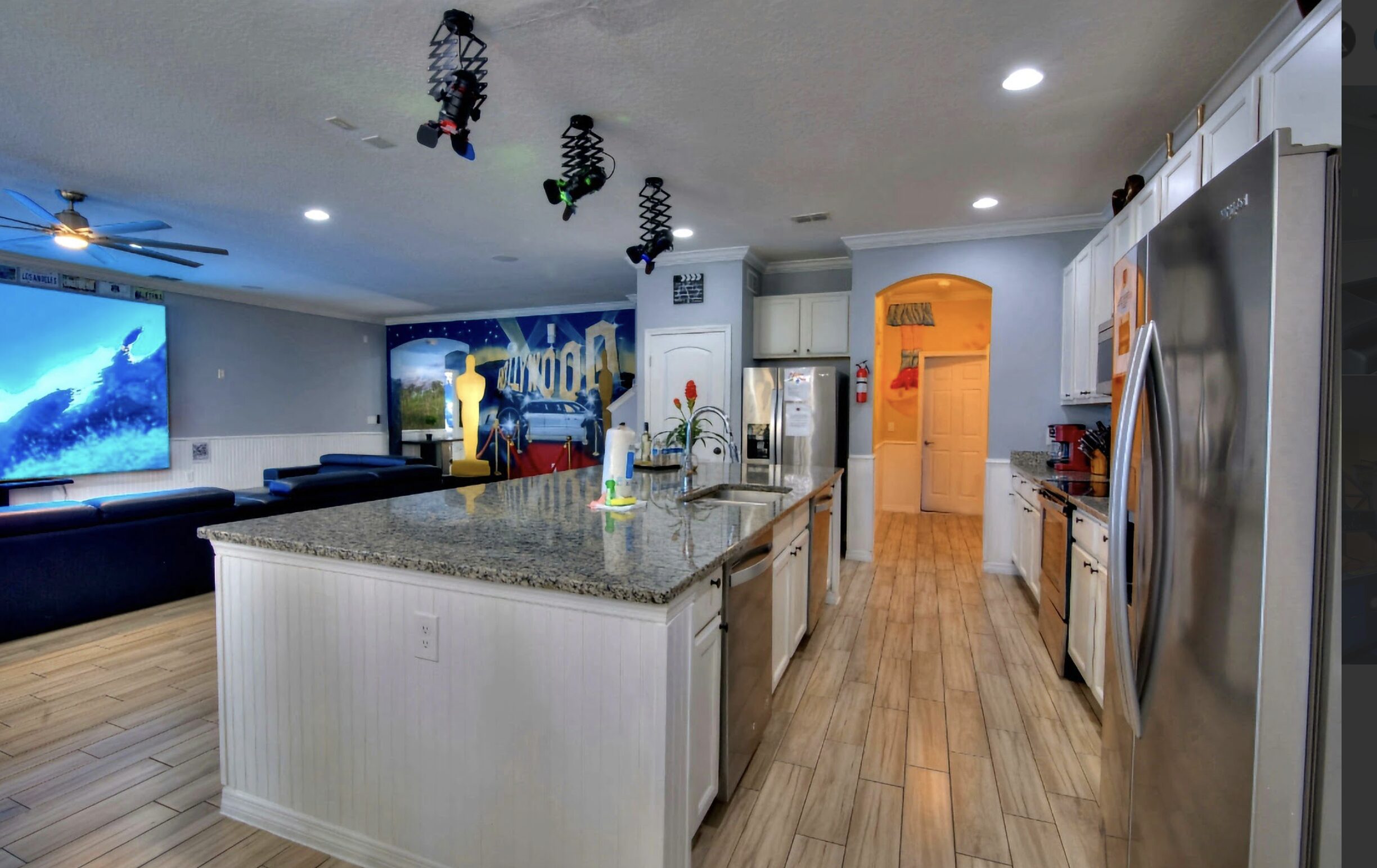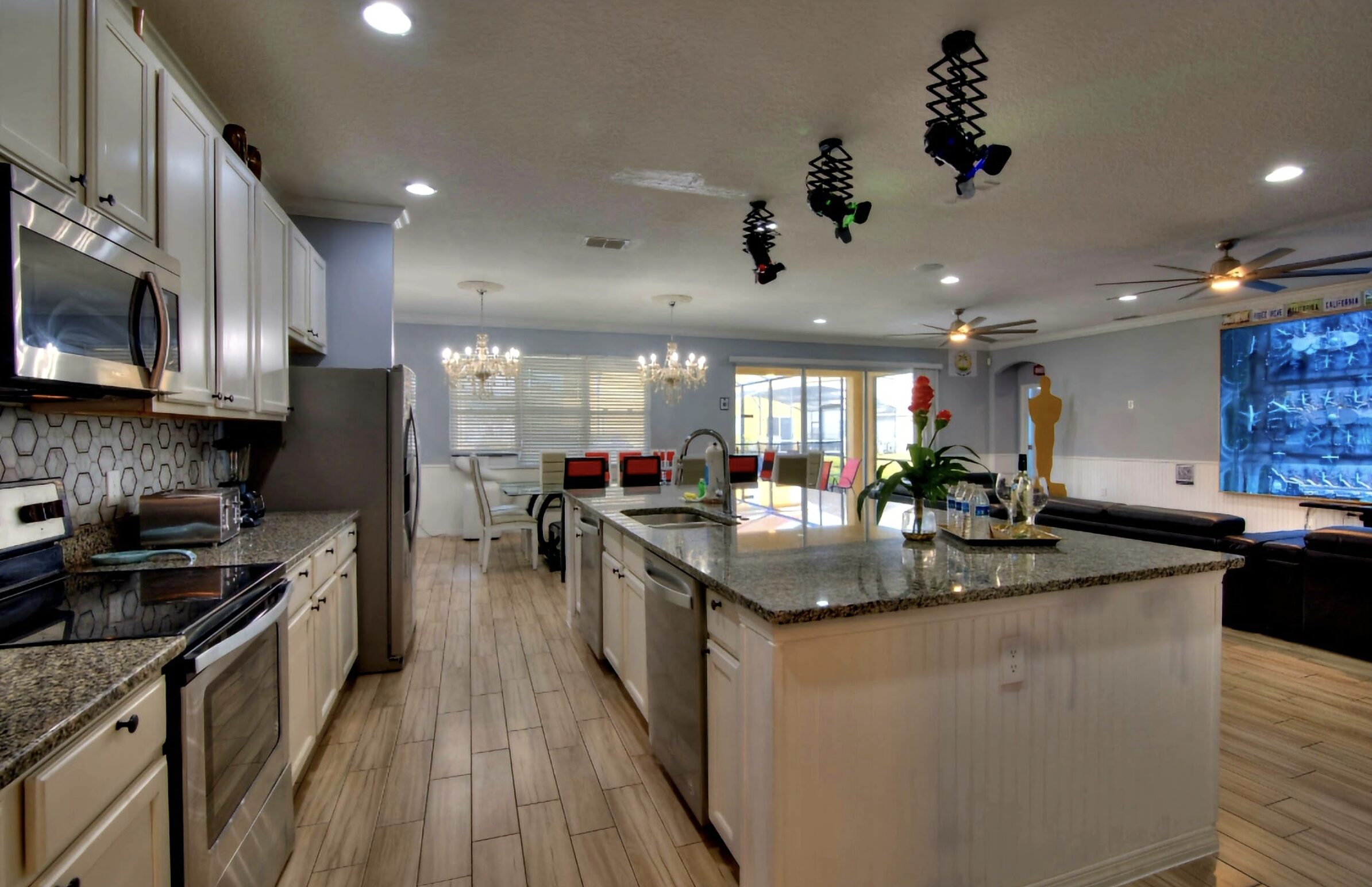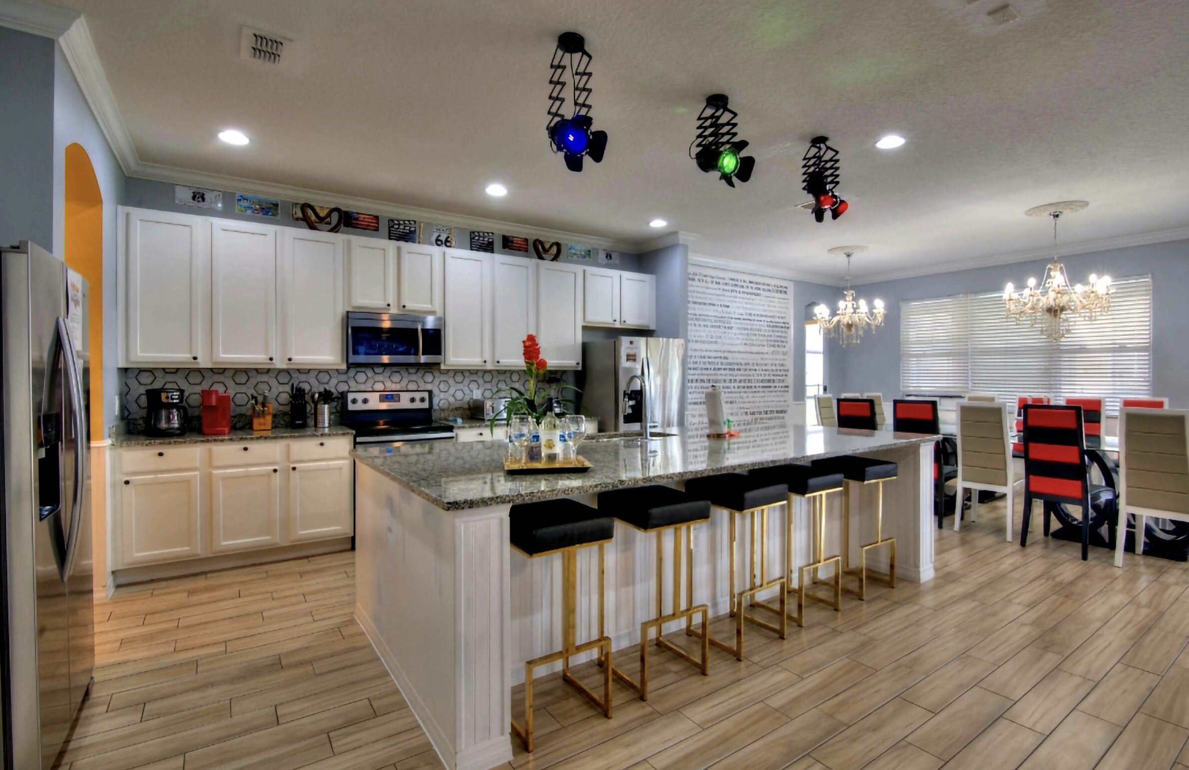 There is plenty of open space for group gatherings (living room), with a massive Kitchen Island with additional chairs for the group to enjoy quality meals together. The Kitchen is fully equipped for the most discerning chef
