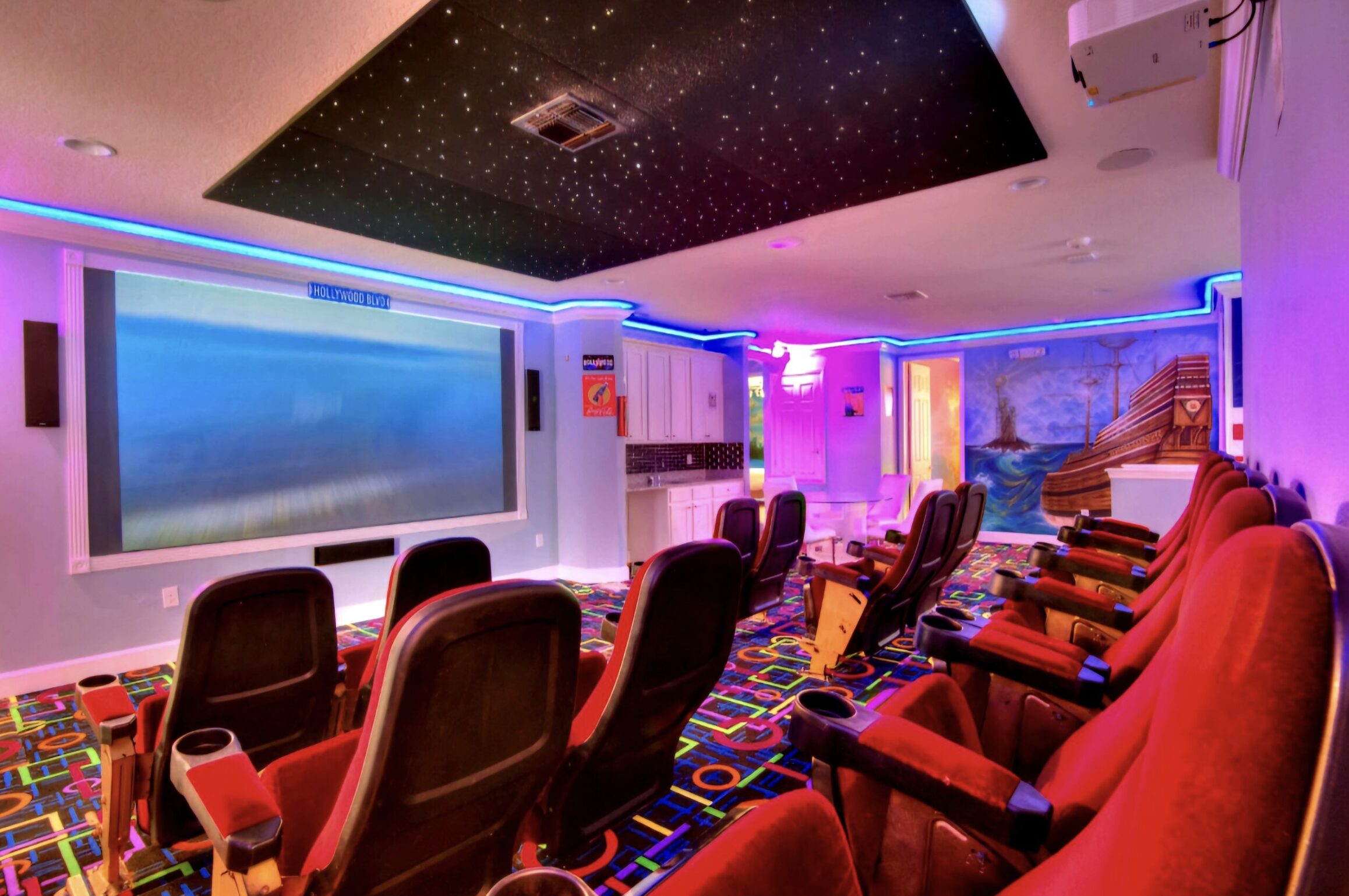 x3 120-inch projector screens, with an additional 120-inch projector in the main family living room area