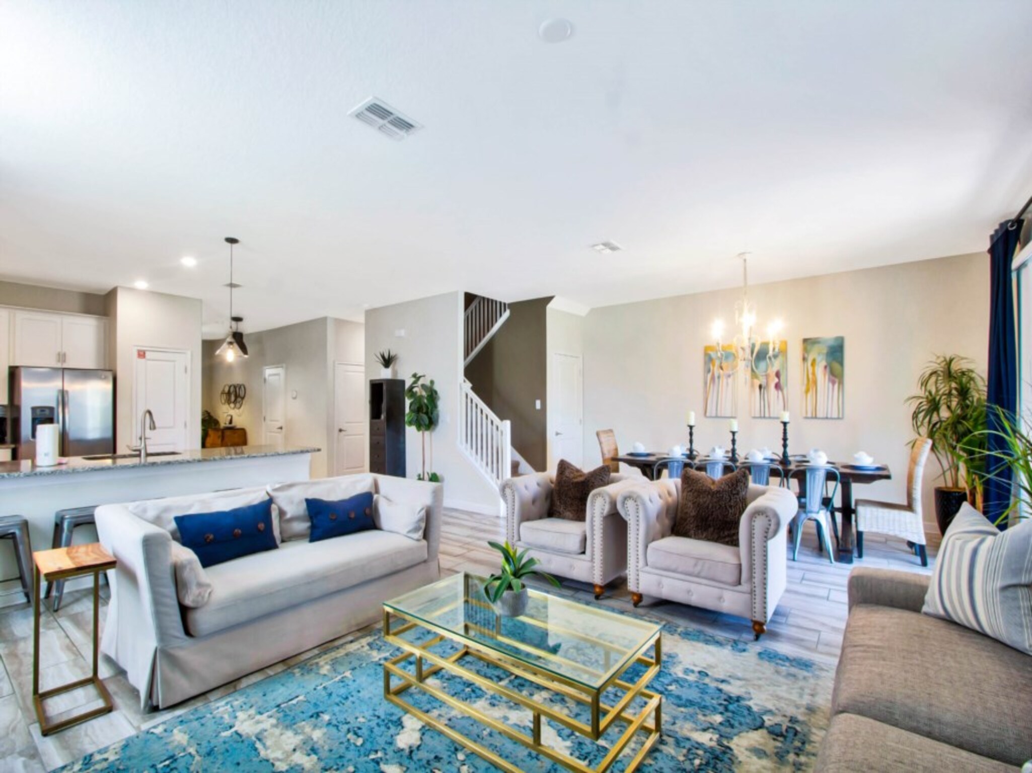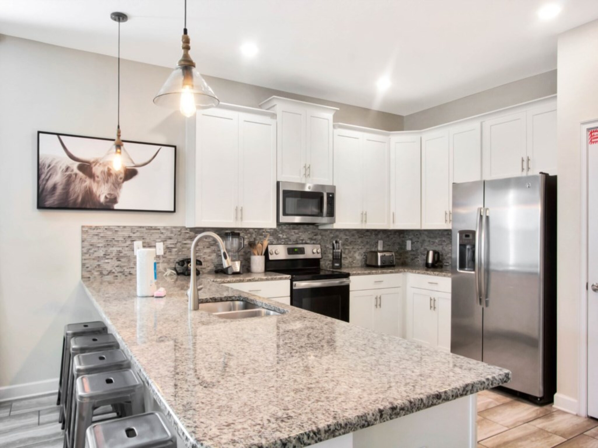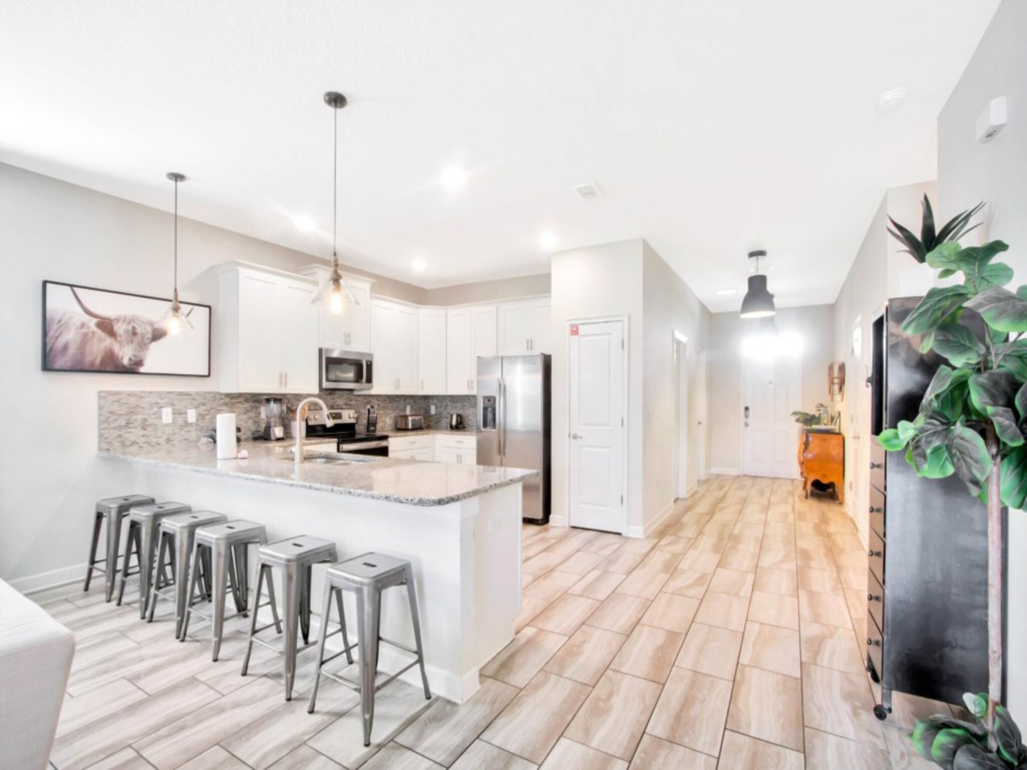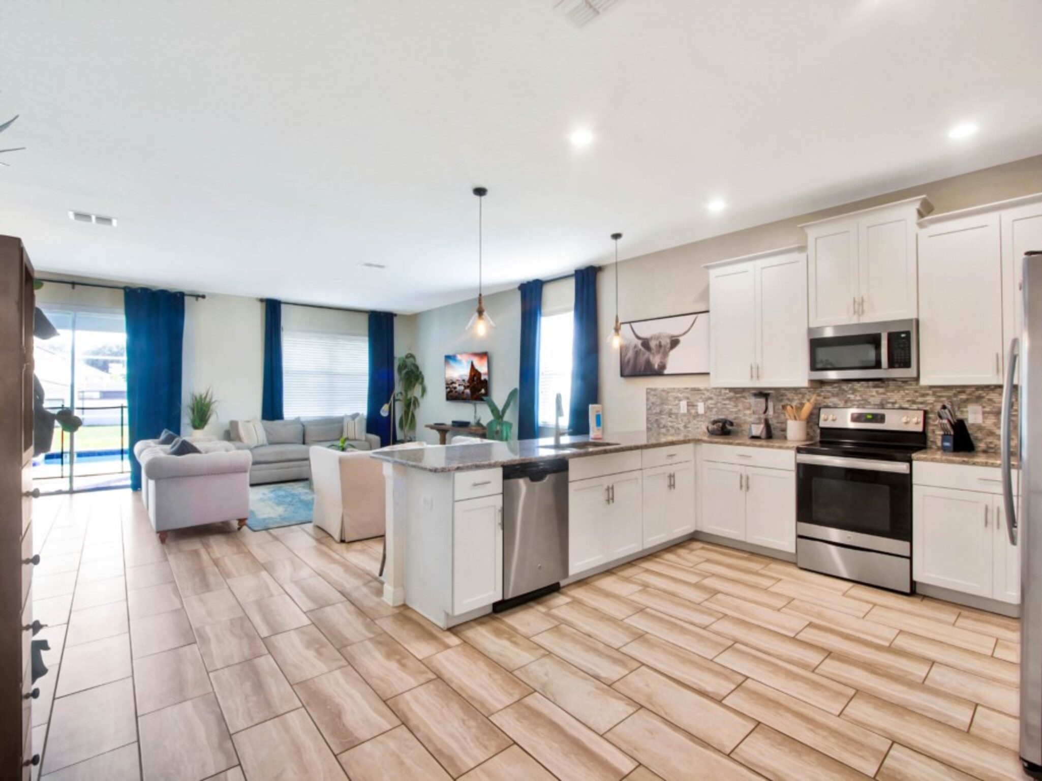 This stylish 8-bedroom, 5-bathroom, a vacation home in Orlando, can comfortably accommodate 12 guests in a luxurious living space, offering an ideal size and layout for large families and groups traveling together. As you walk into the home you will be welcomed into the open-concept living area. The modern-styled kitchen has stainless steel appliances and sleek countertops, perfect for prepping meals for the whole family. Have seat at the breakfast bar and plan out the day, or enjoy a snack before heading out to a theme park. The living area has plenty of comfortable seating for everyone to come together and watch a TV show.