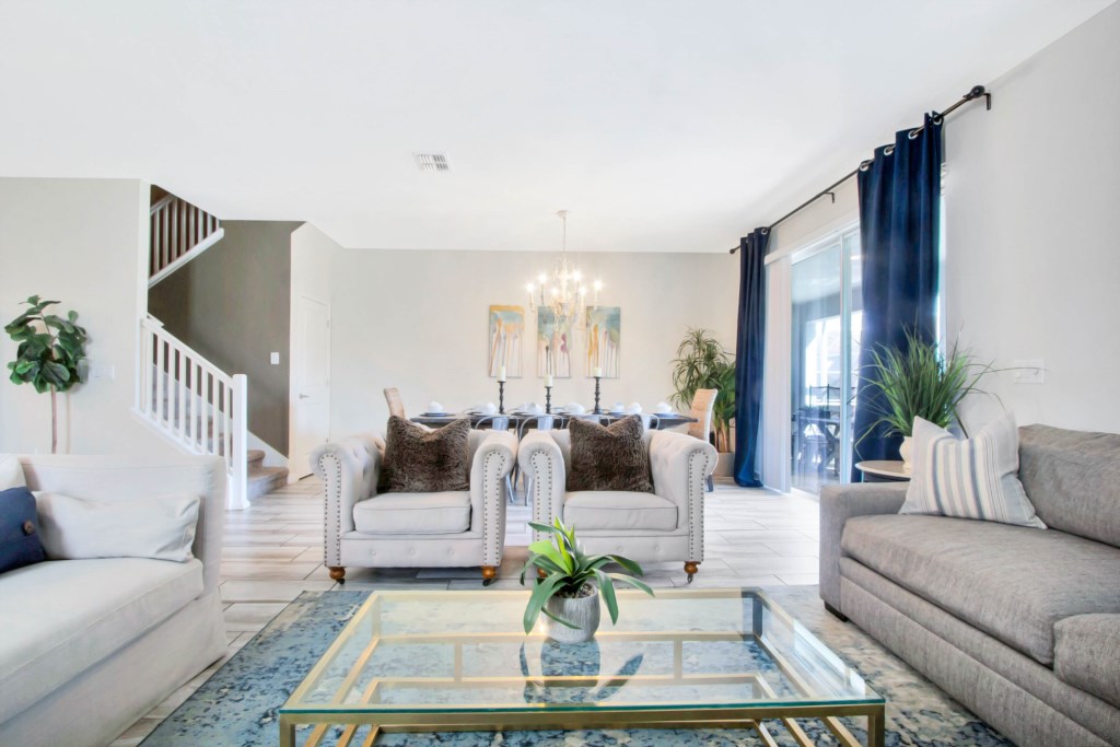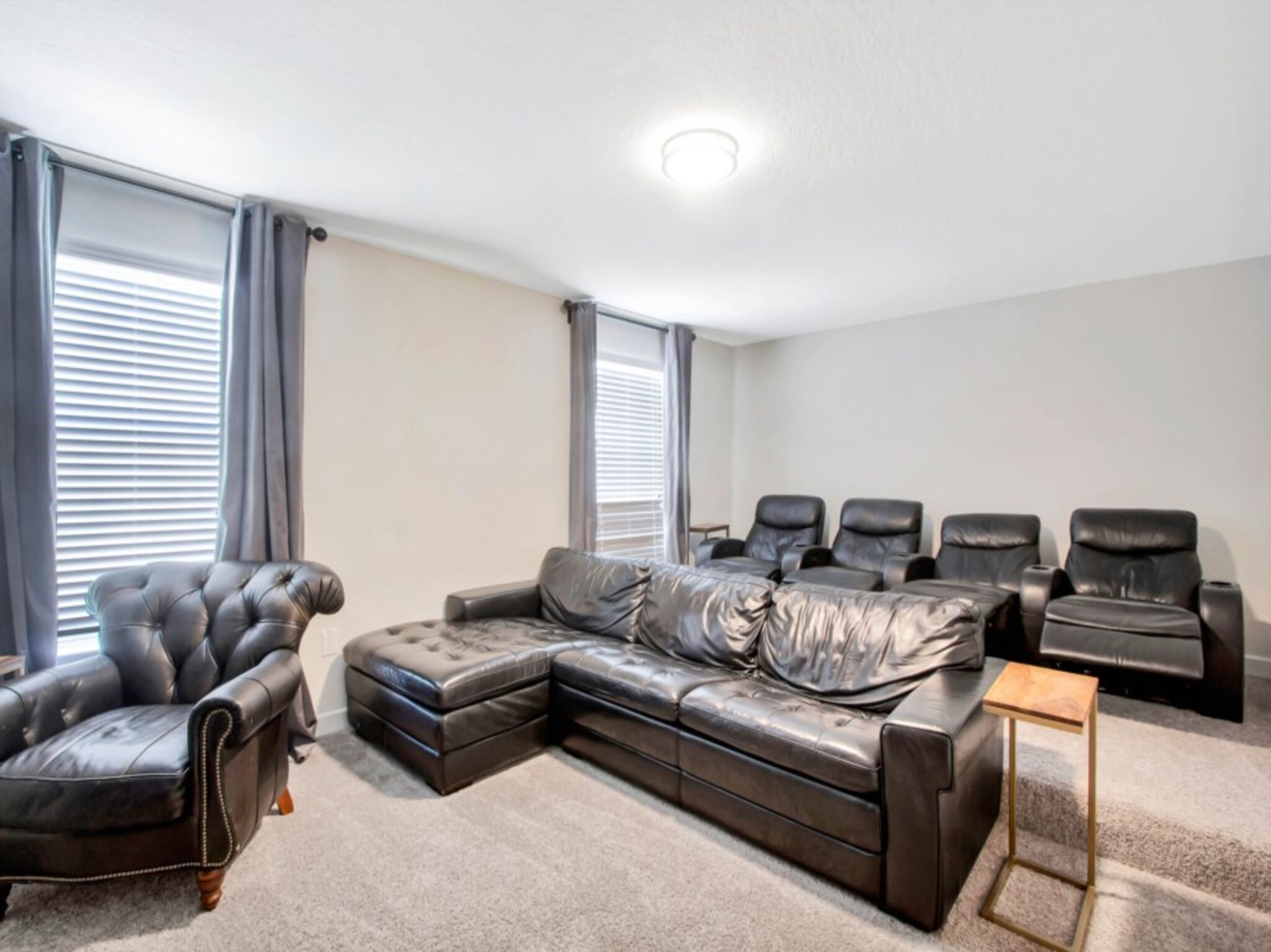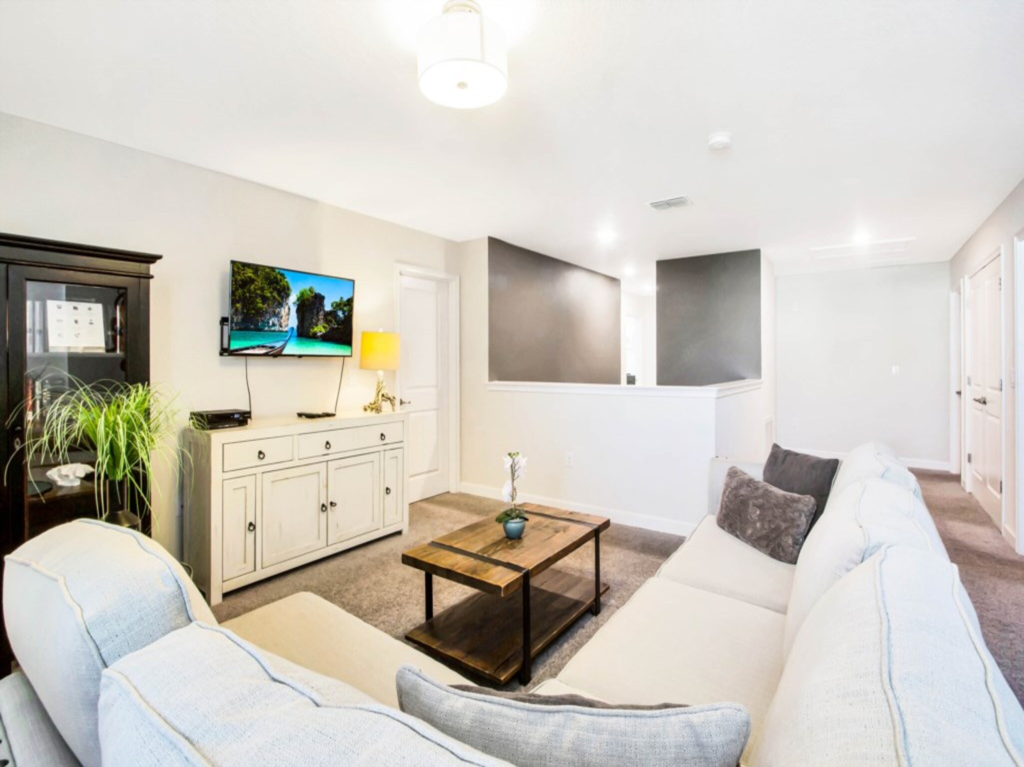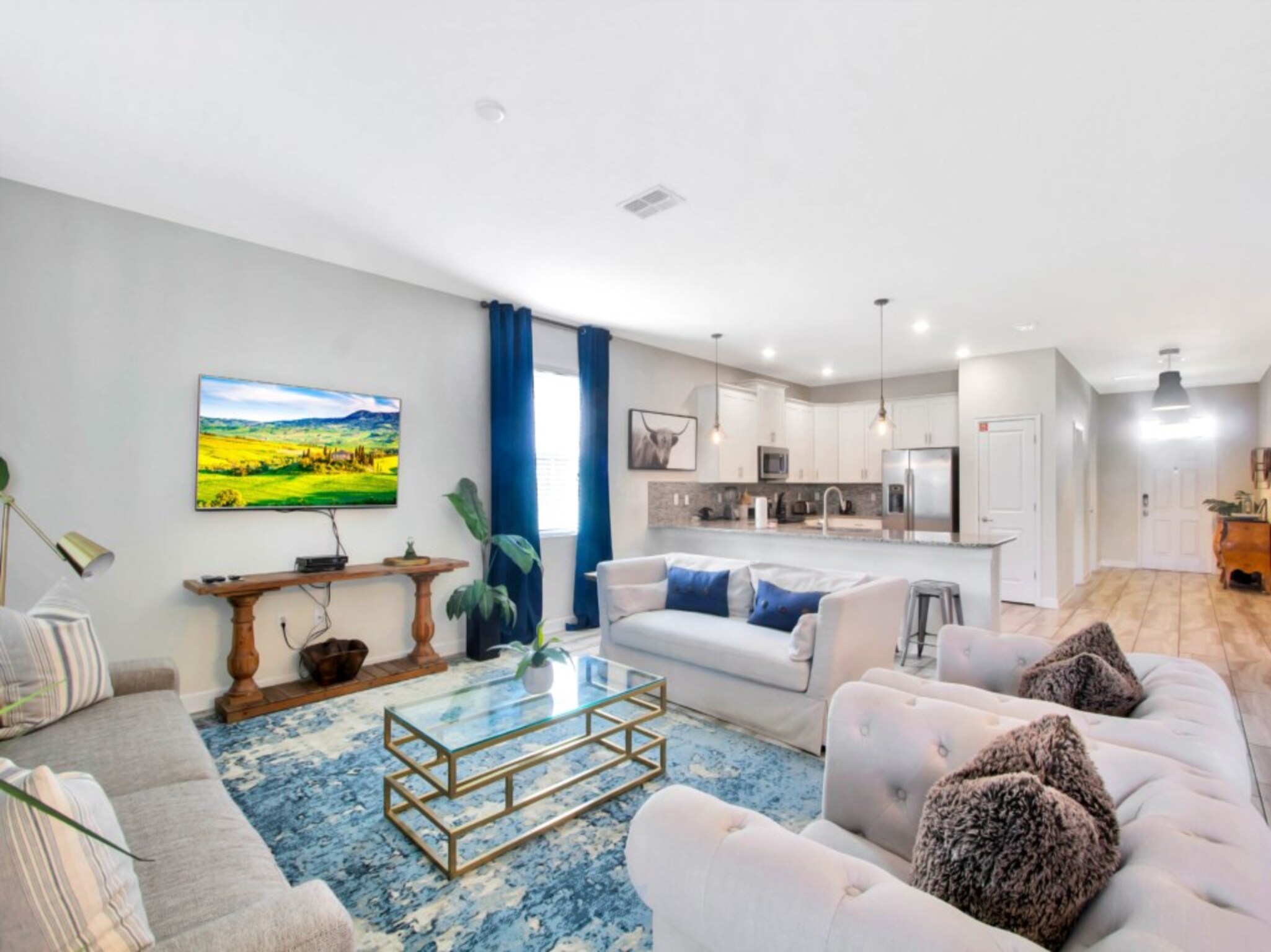 This stylish 8-bedroom, 5-bathroom, a vacation home in Orlando, can comfortably accommodate 12 guests in a luxurious living space, offering an ideal size and layout for large families and groups traveling together. As you walk into the home you will be welcomed into the open-concept living area. The modern-styled kitchen has stainless steel appliances and sleek countertops, perfect for prepping meals for the whole family. Have seat at the breakfast bar and plan out the day, or enjoy a snack before heading out to a theme park. The living area has plenty of comfortable seating for everyone to come together and watch a TV show.