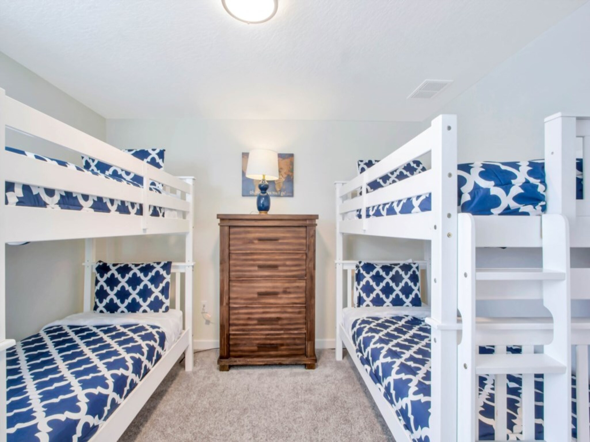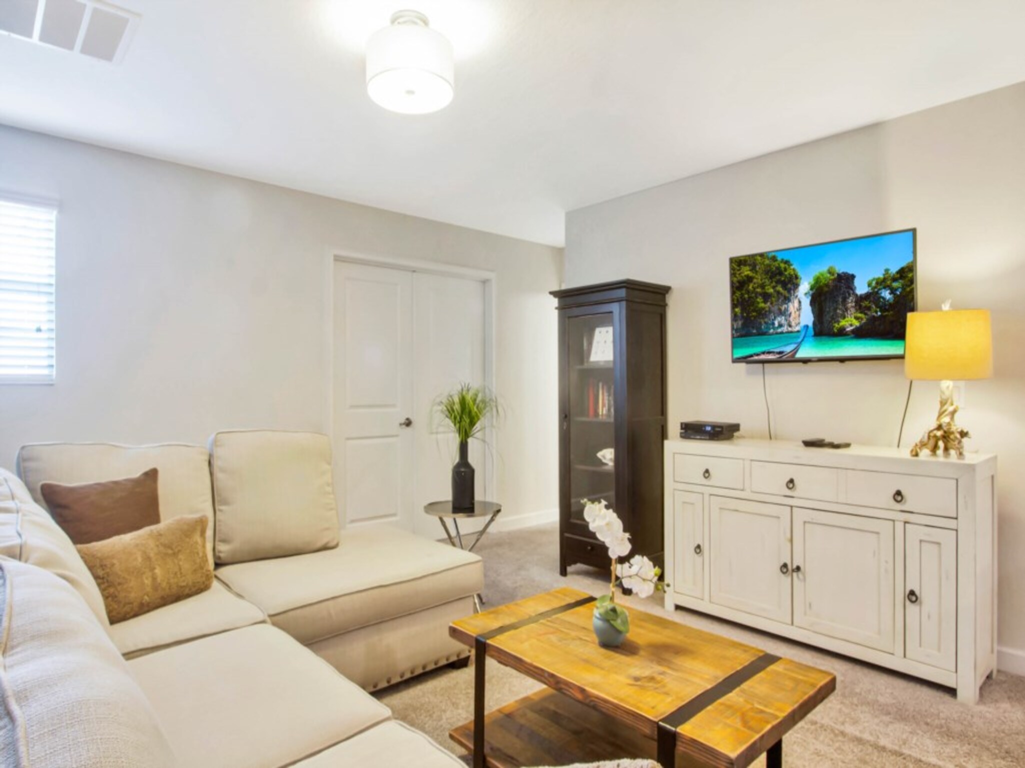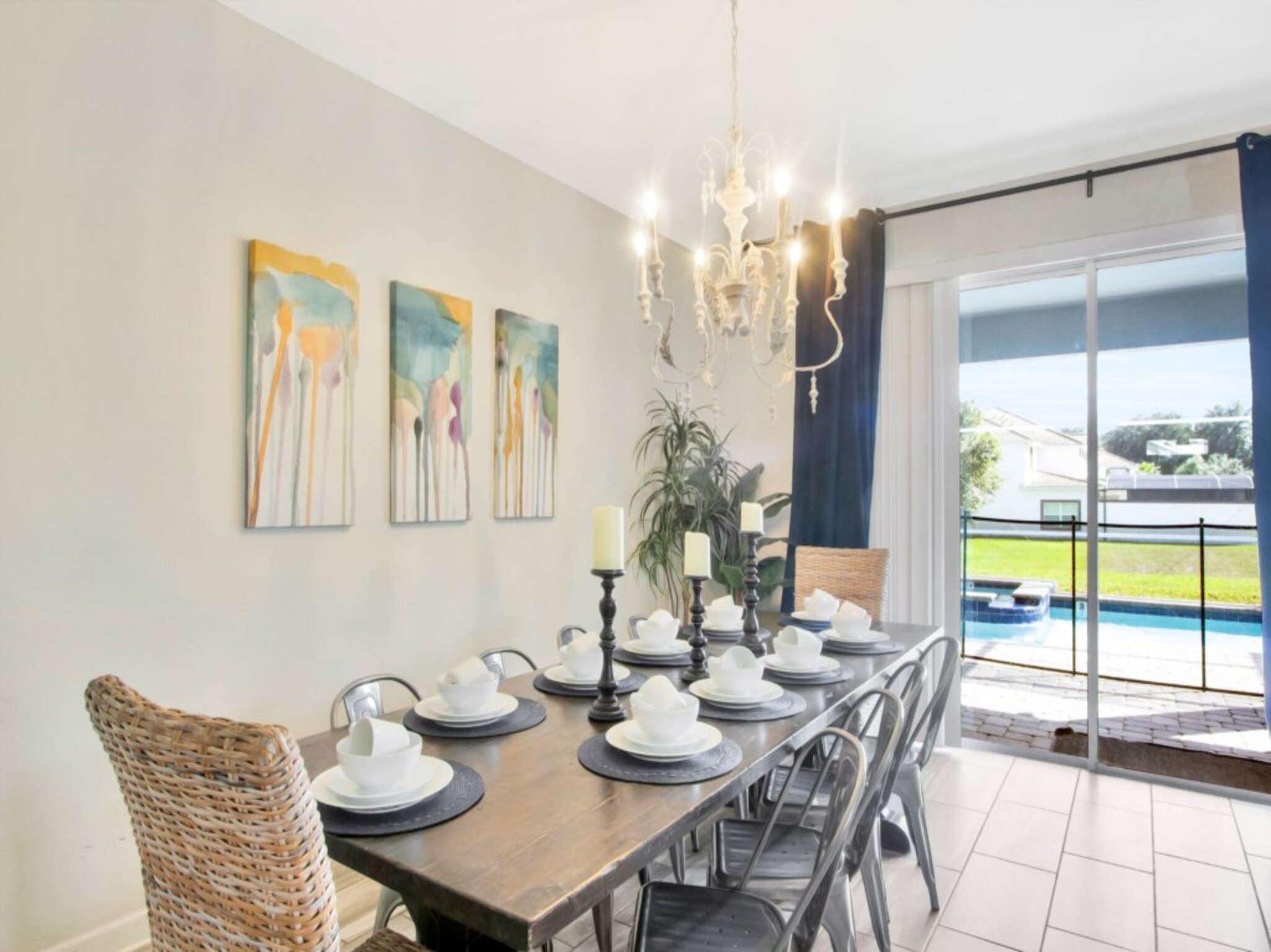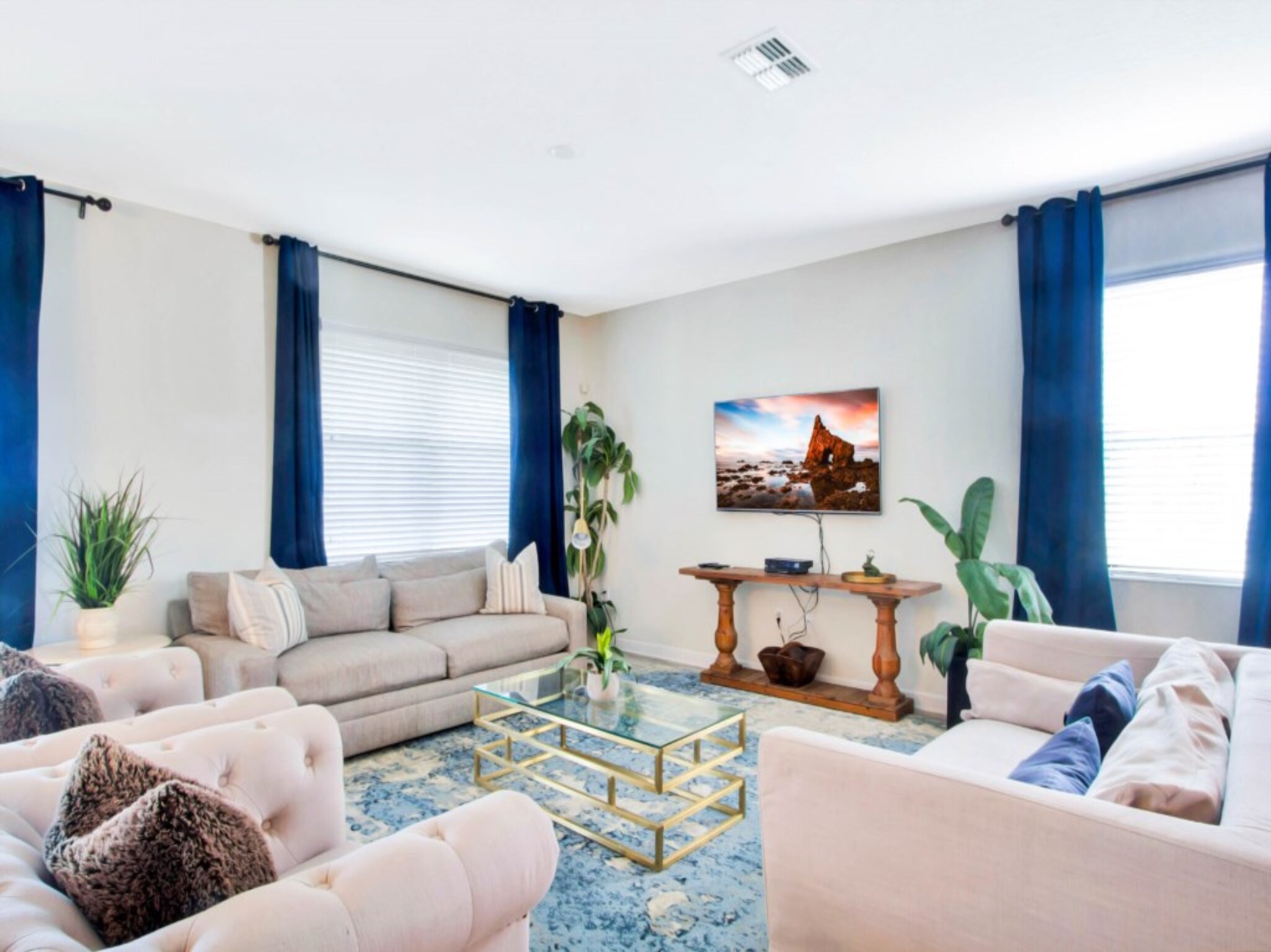 This stylish 8-bedroom, 5-bathroom, a vacation home in Orlando, can comfortably accommodate 12 guests in a luxurious living space, offering an ideal size and layout for large families and groups traveling together. As you walk into the home you will be welcomed into the open-concept living area. The modern-styled kitchen has stainless steel appliances and sleek countertops, perfect for prepping meals for the whole family. Have seat at the breakfast bar and plan out the day, or enjoy a snack before heading out to a theme park. The living area has plenty of comfortable seating for everyone to come together and watch a TV show.