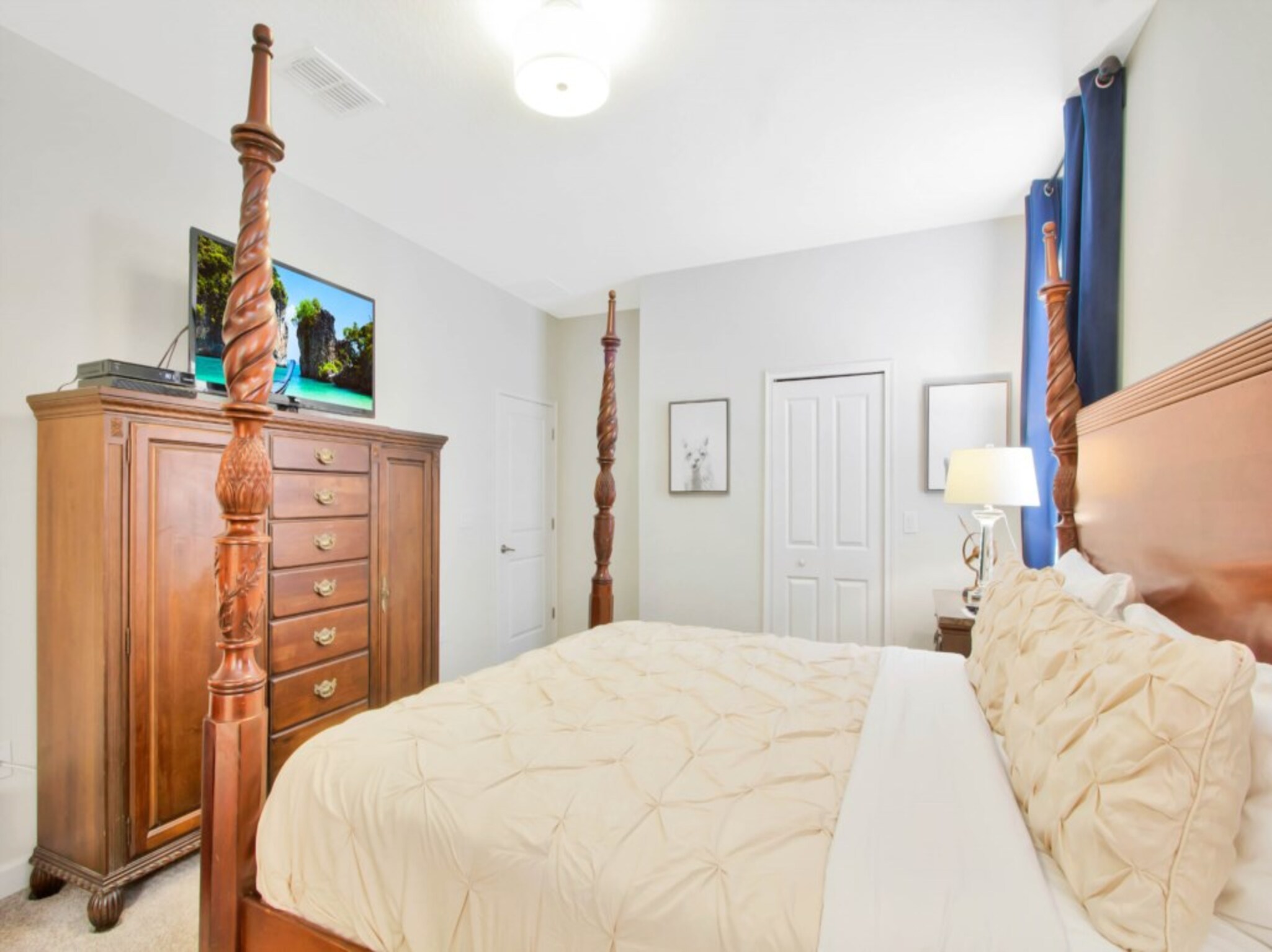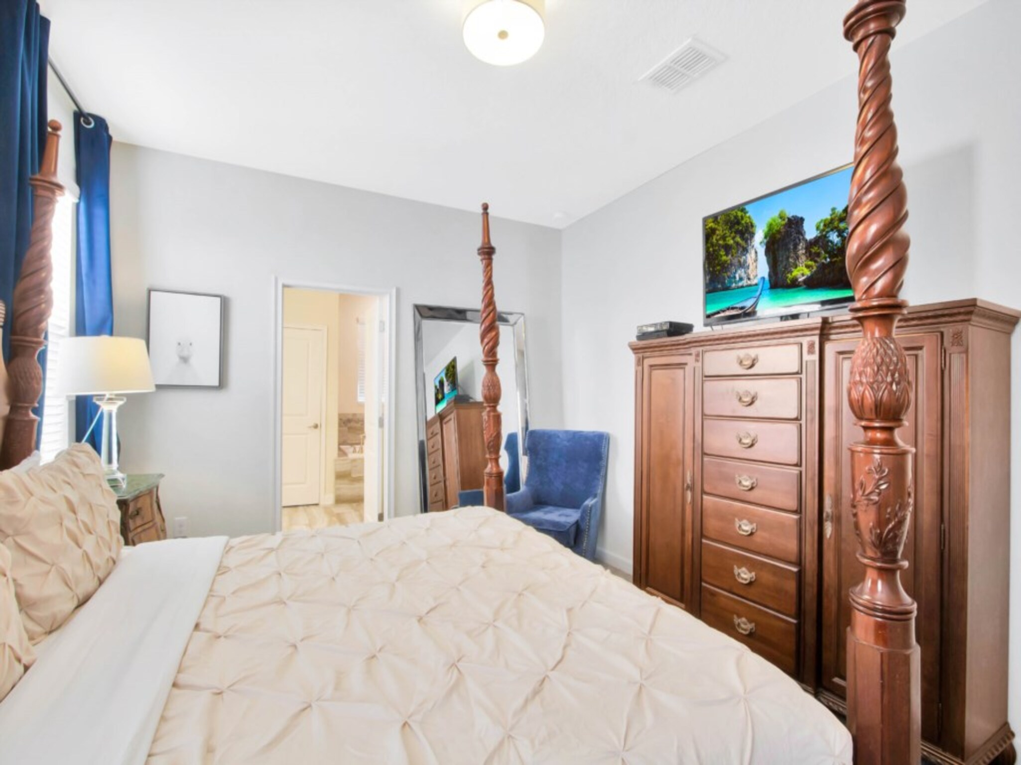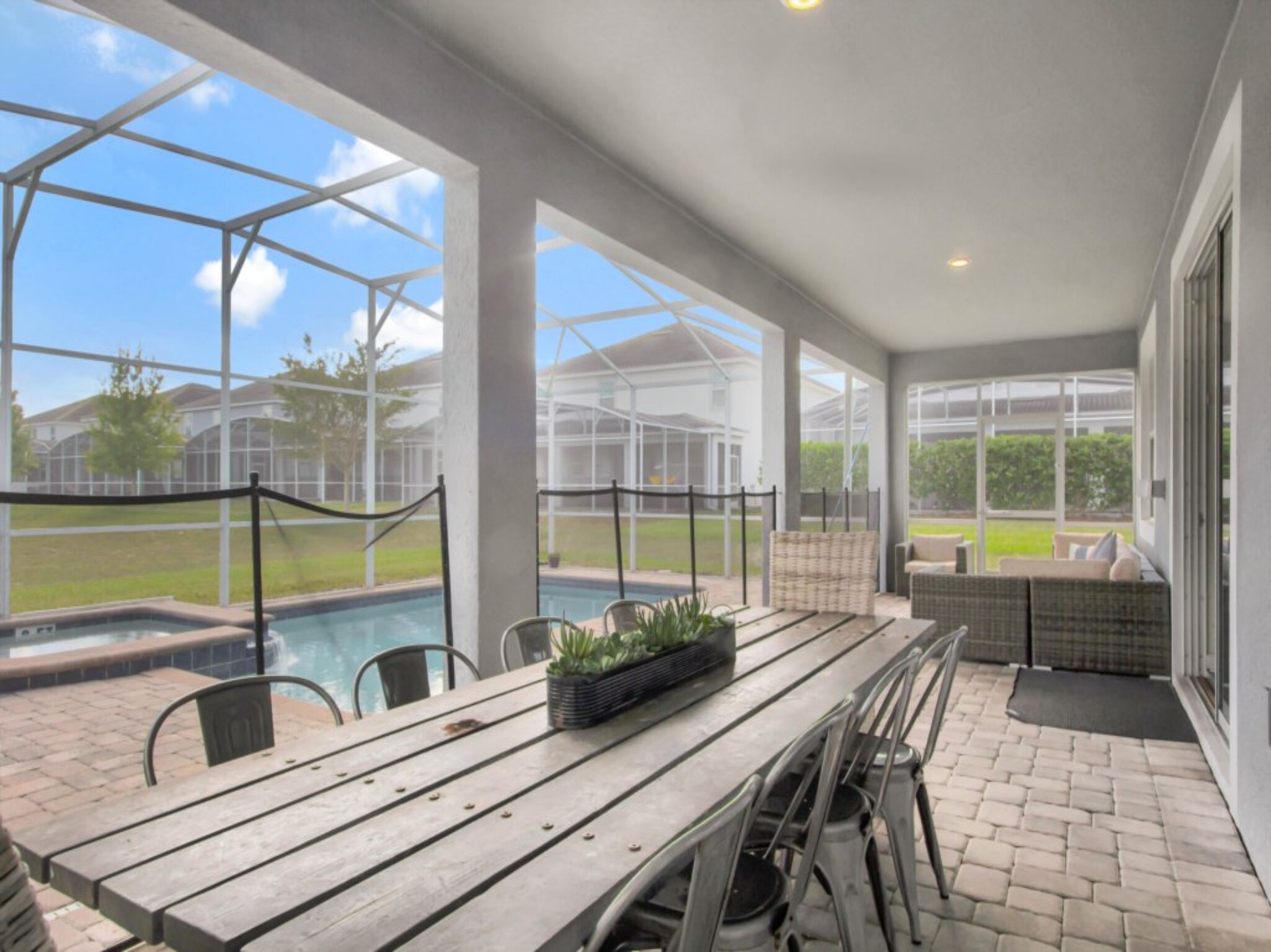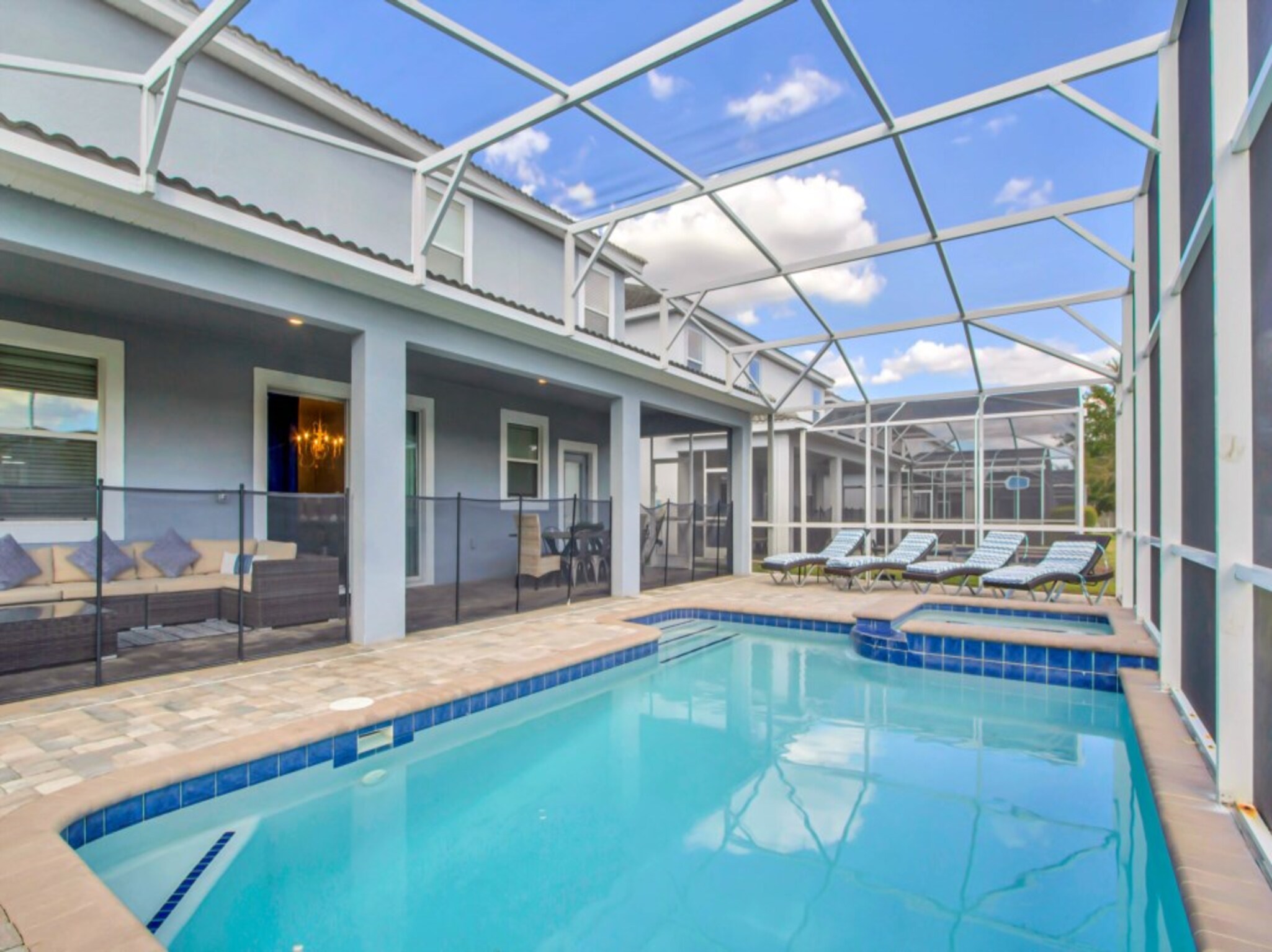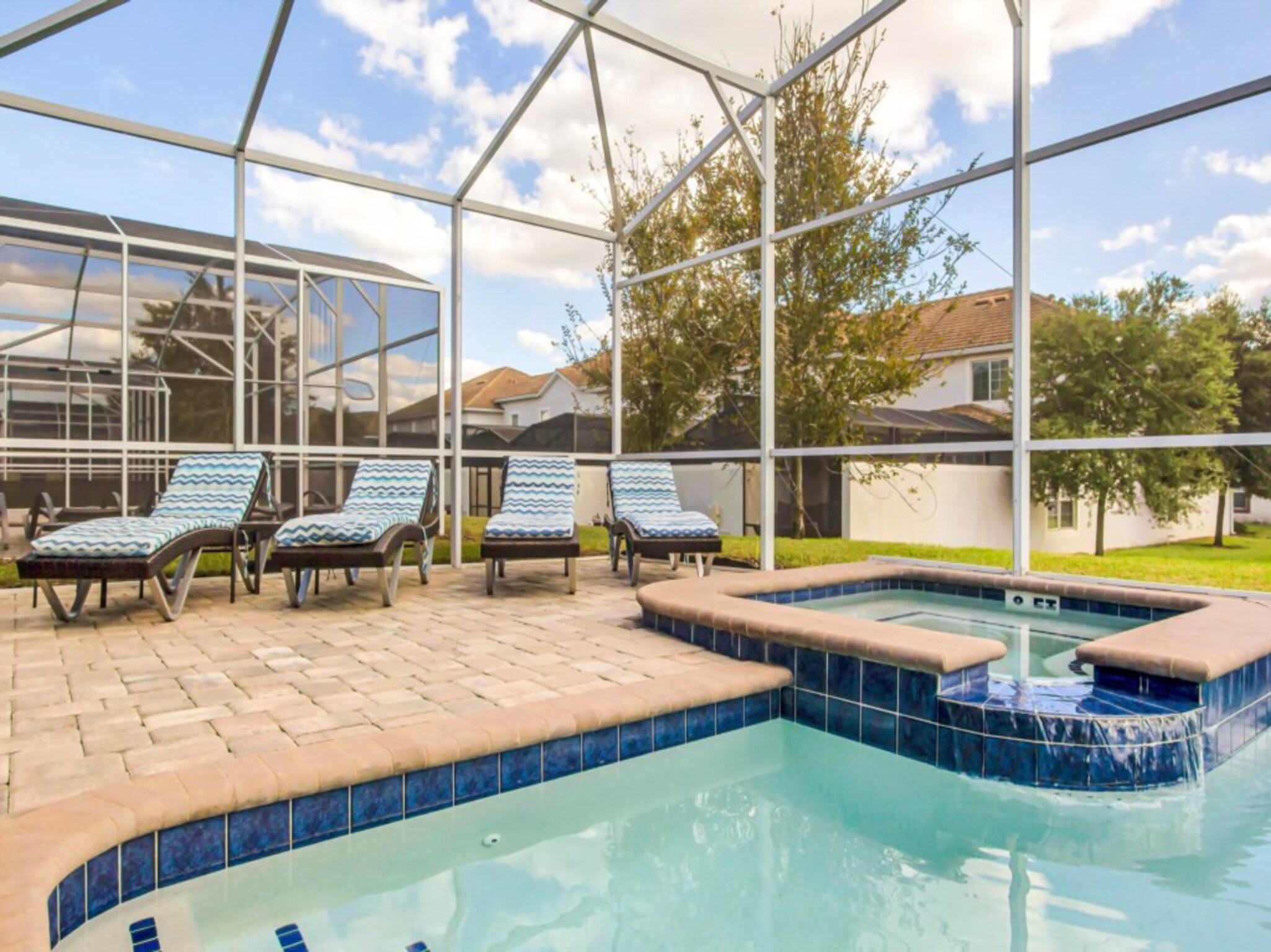 Walk onto the private patio to your own screened-in pool with a spillover spa. Relax in a sun lounger or take a dip to cool off. There is an outdoor dining table so you can dine under the stars. Stay entertained with the built-in TV. If you have little ones, there is a safety fence that can be set up as well.