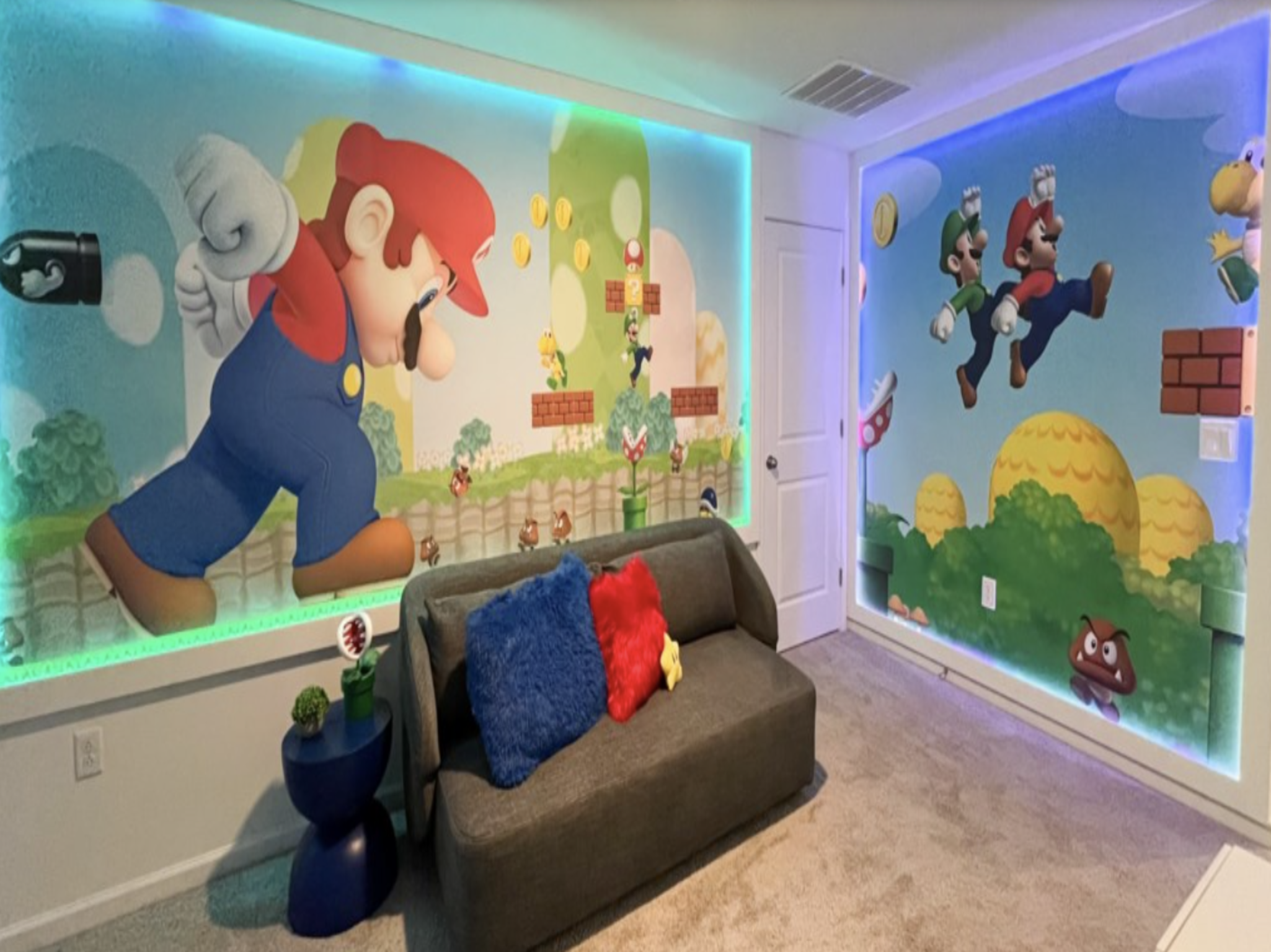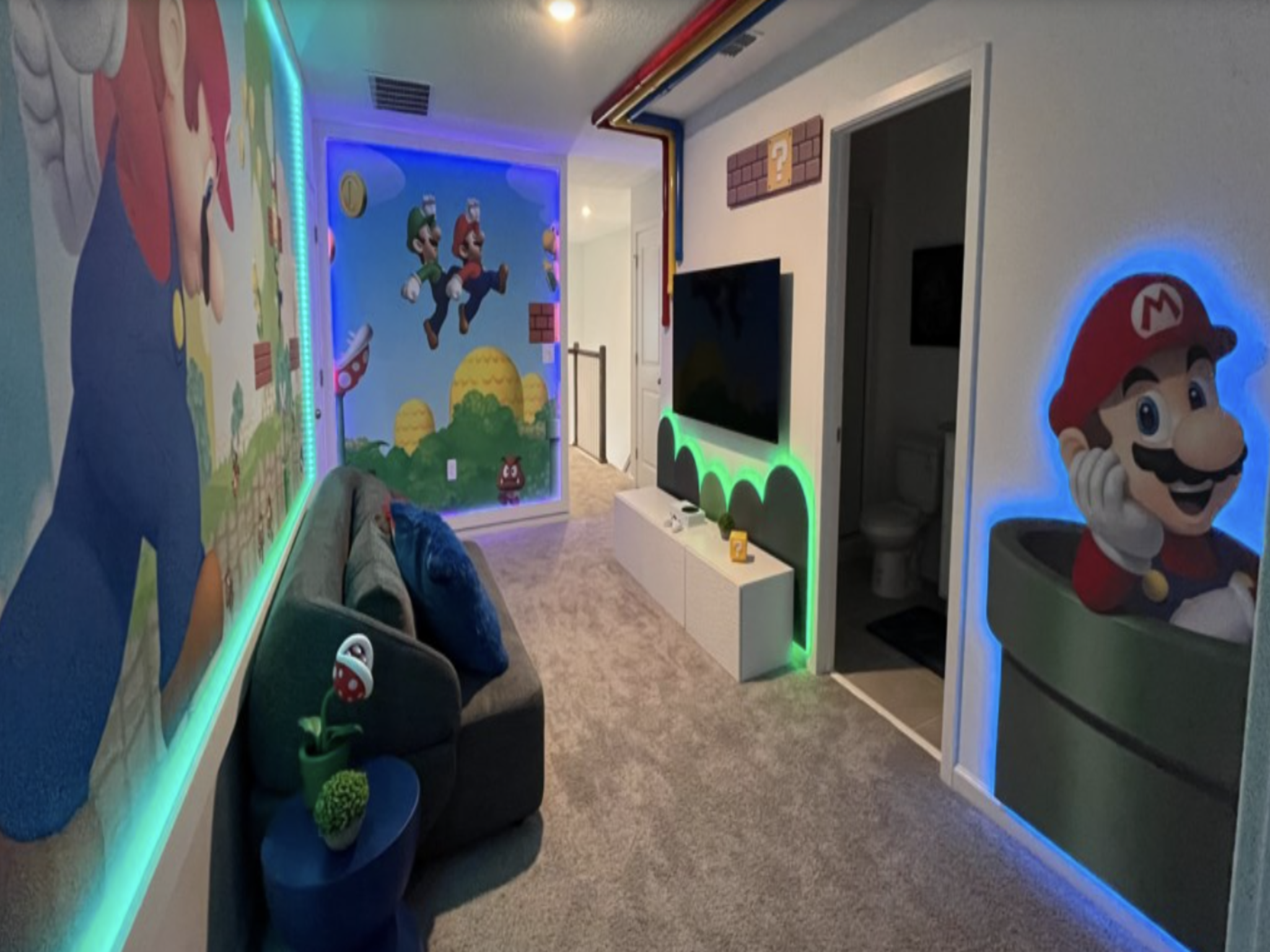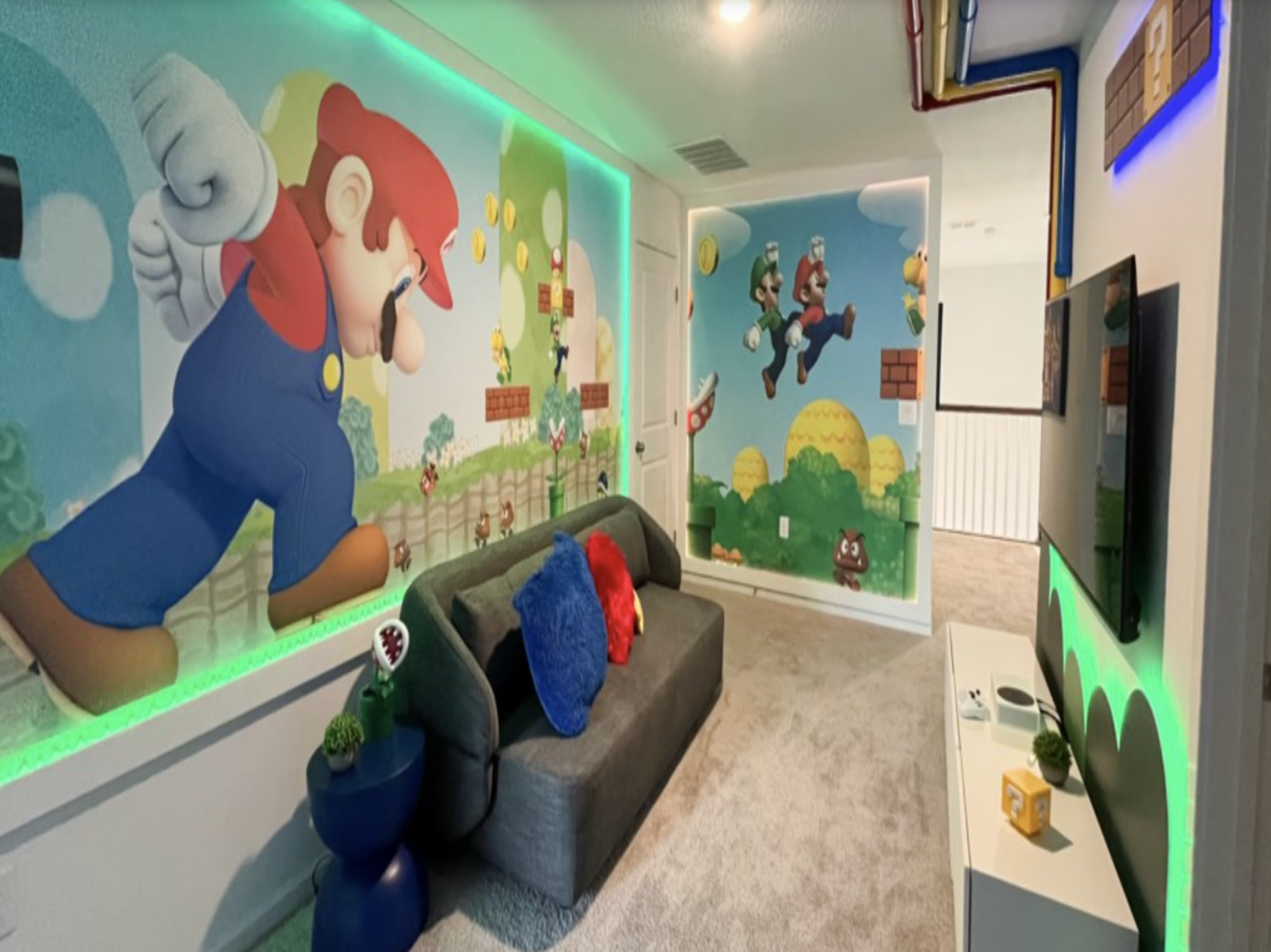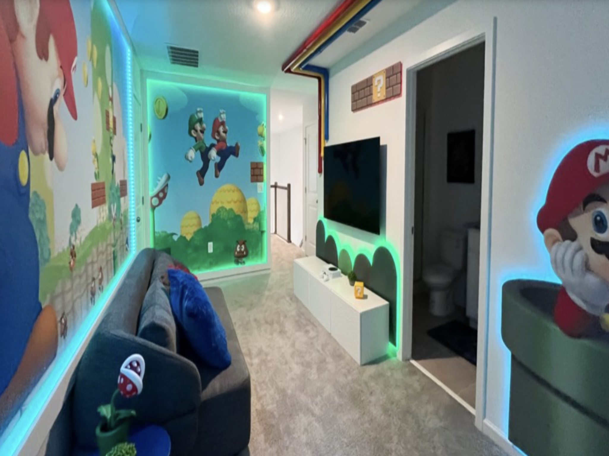 Super Mario Retreat is more than just a place to stay – it’s an experience! This spacious home brings Disney’s most beloved characters to life with fun, themed rooms that both children and adults will love. From the master suite to the playful Mario and Luigi loft, every detail is designed to create a magical atmosphere. Whether you’re relaxing in the modern king suite or exploring the Frozen and Star Wars themed rooms, this home offers the perfect blend of relaxation and excitement.