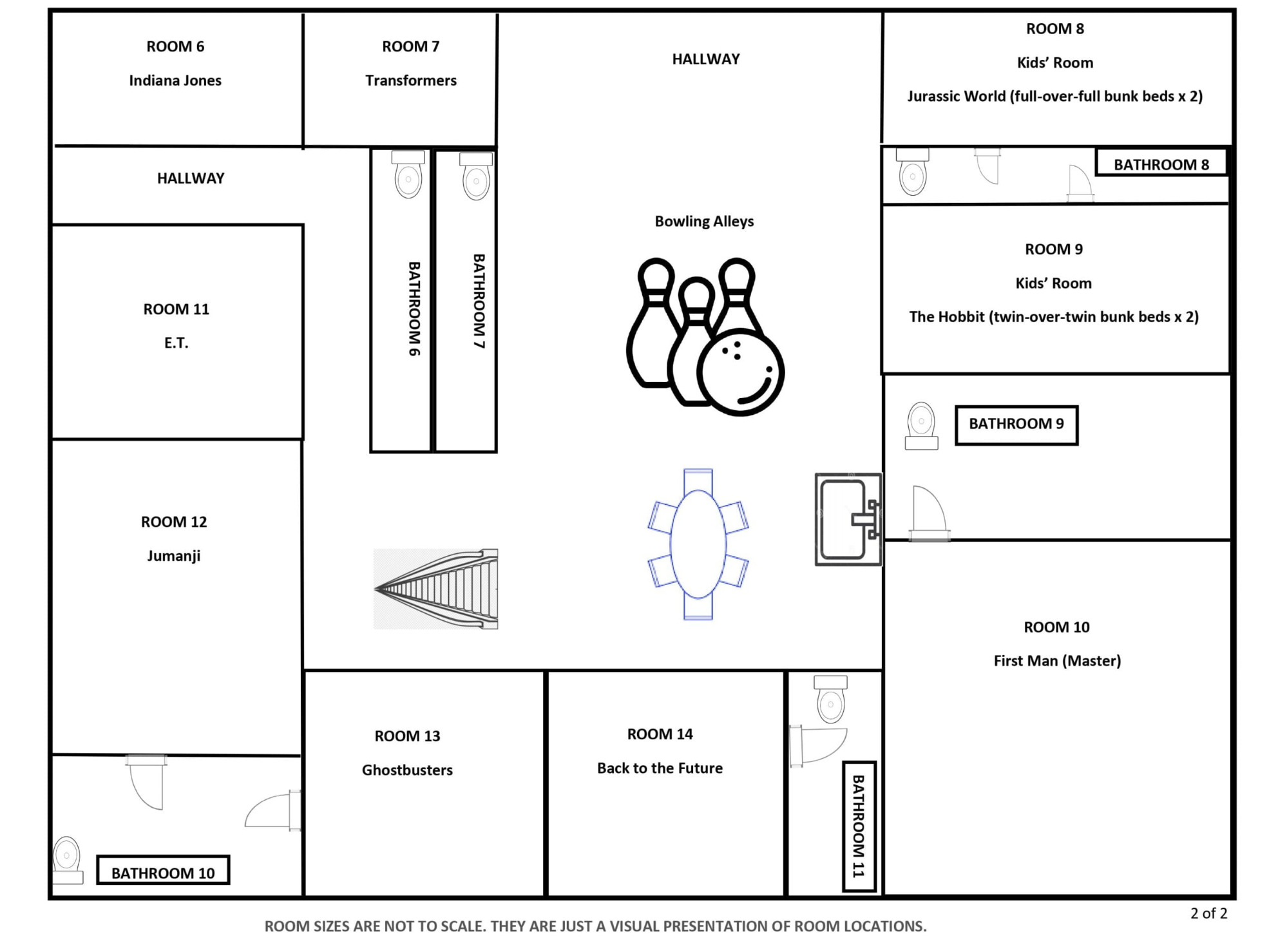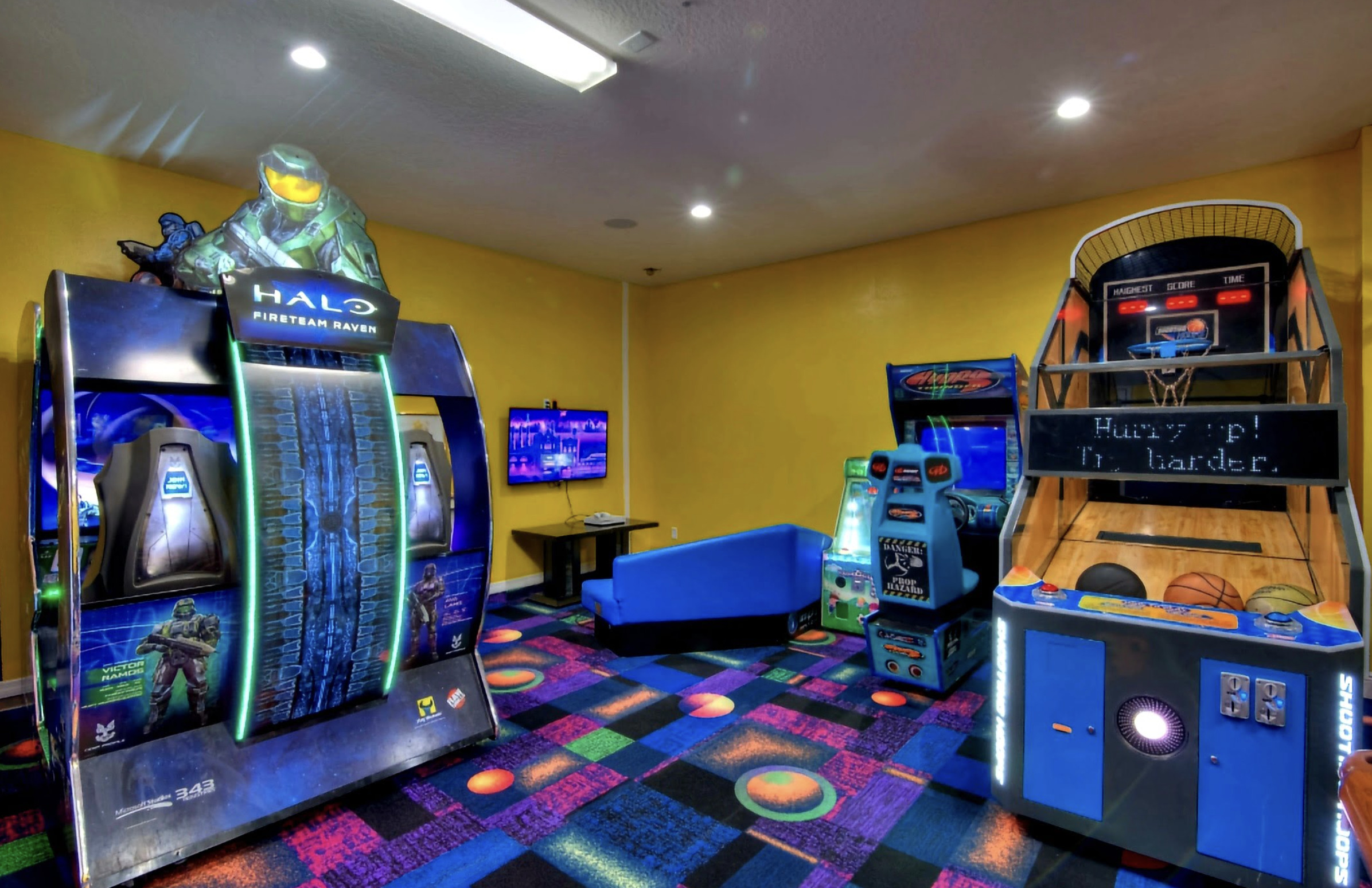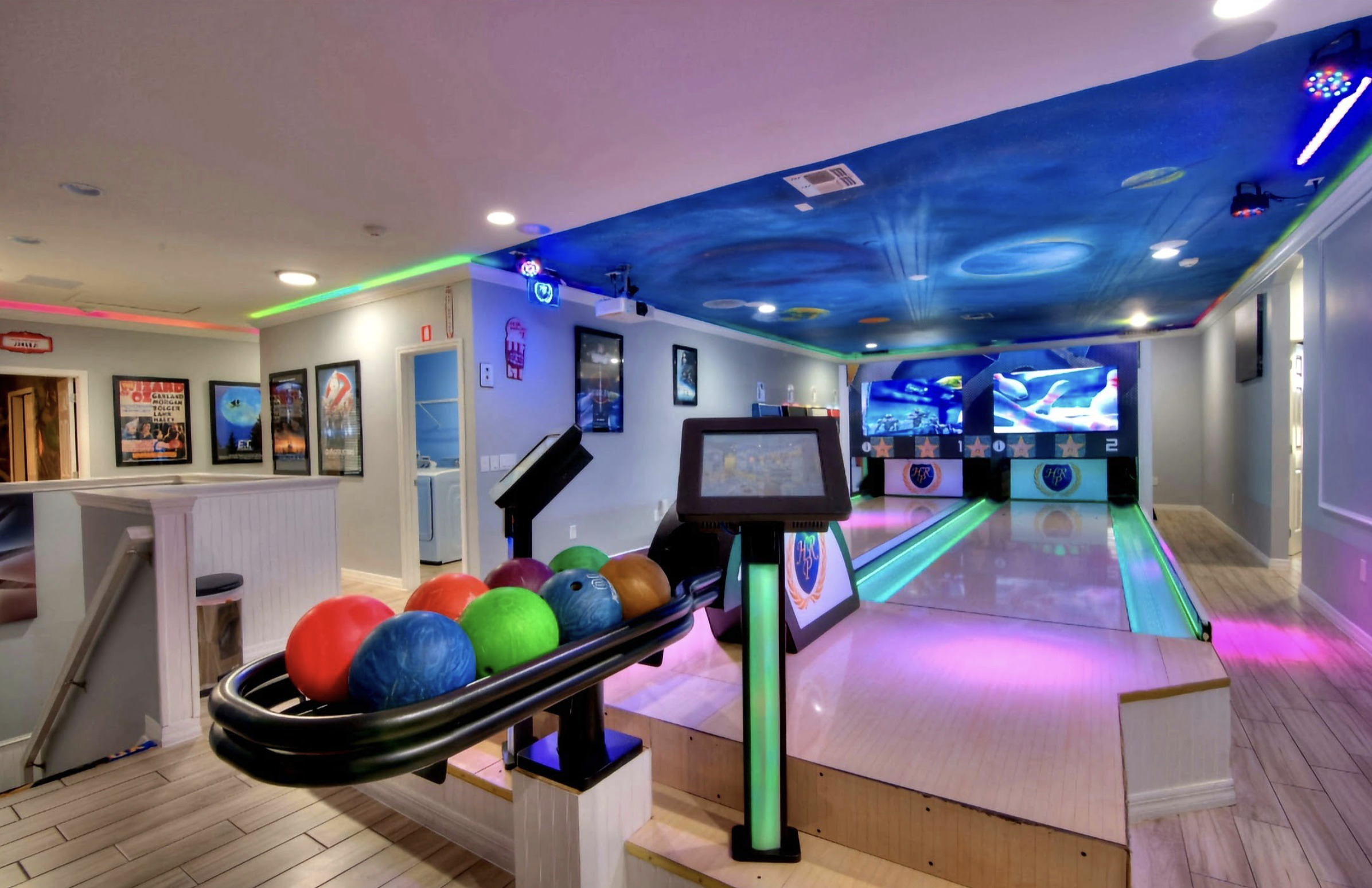 Indulge in a plethora of amenities designed for entertainment and leisure, including a private bowling alley, Halo virtual arcade game, heated pool & spa, pool table, air hockey table, basketball hoops, hydro thunder, happy baby basketball, electronic piano, and more. Relax in the spacious living room with a large TV and premium-quality audio system, or retreat to the comfort of our Smart 4k TVs and carpeted floors in all 14 bedrooms.