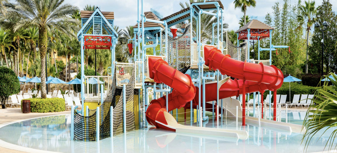 Reunion Resort features an incredible five-acre water park, offering a variety of activities for all ages. Float down the lazy river or experience the thrill of sliding down twisting water slides. Family enjoyment reaches new heights at this tropical water park, where you can bask in the Florida sunshine on a comfortable sun lounger or rent a cabana for a shaded retreat with a refreshing frozen cocktail. The zero-entry pool is perfect for younger children, and the splash playground guarantees endless fun.
